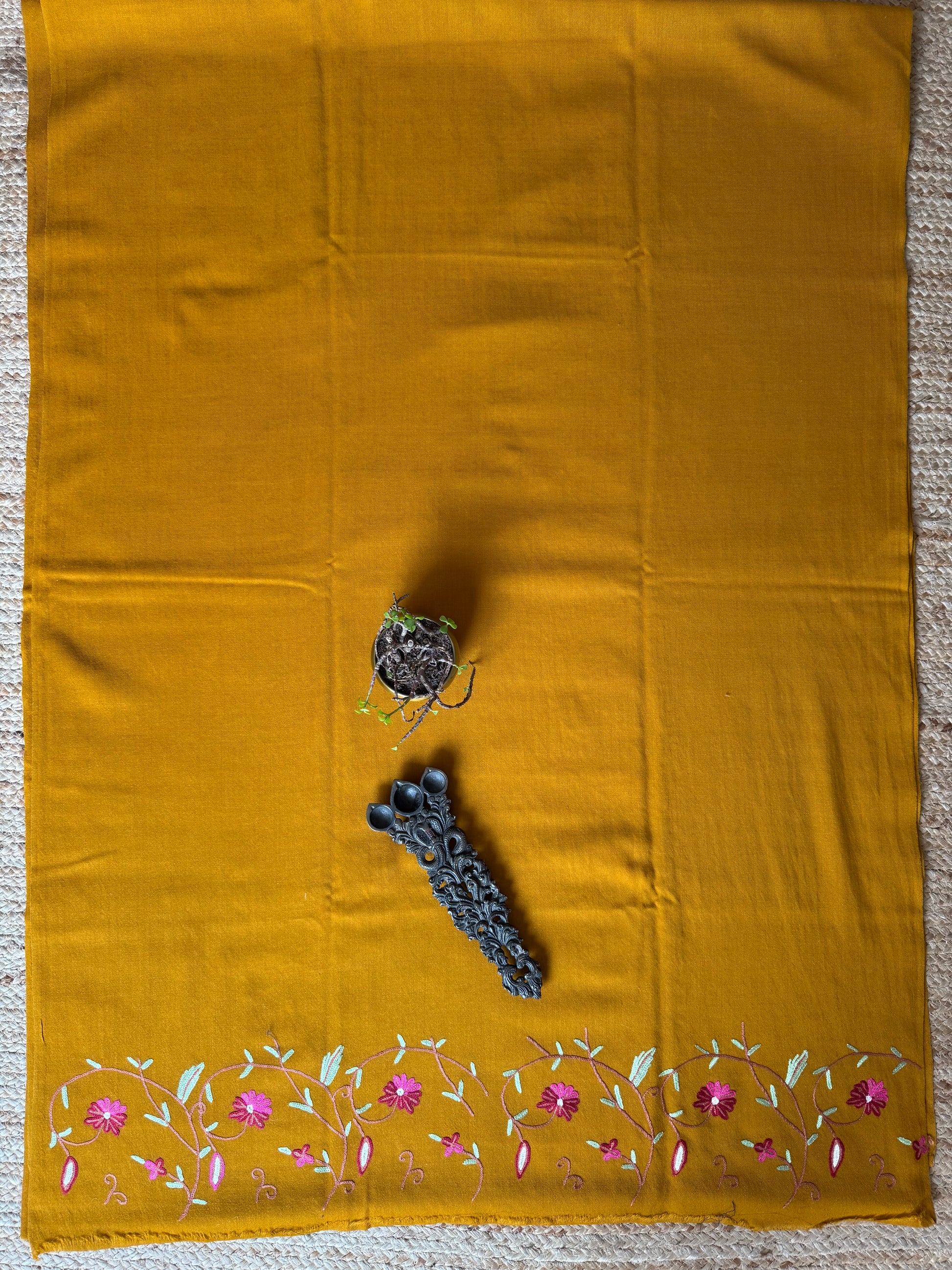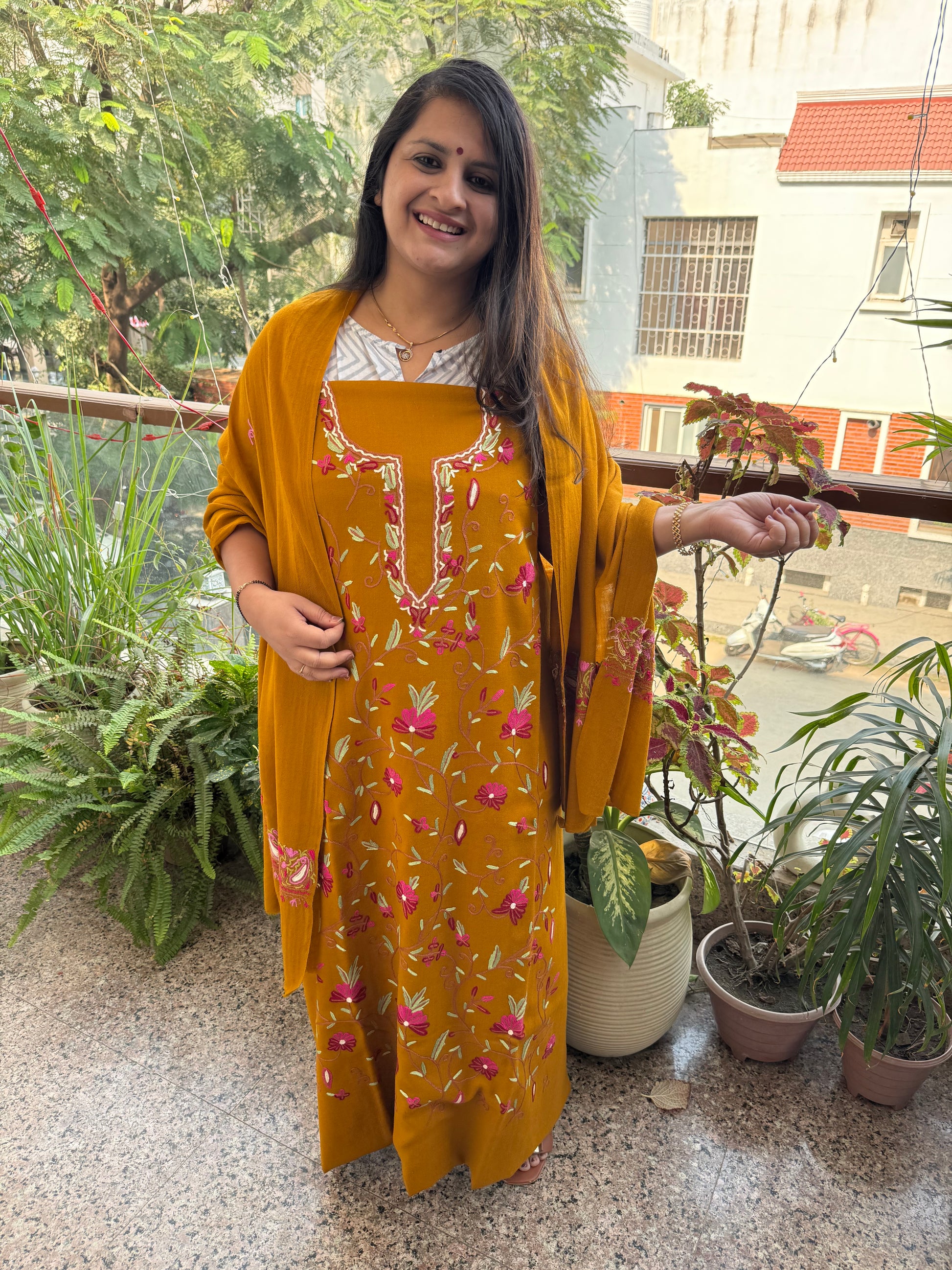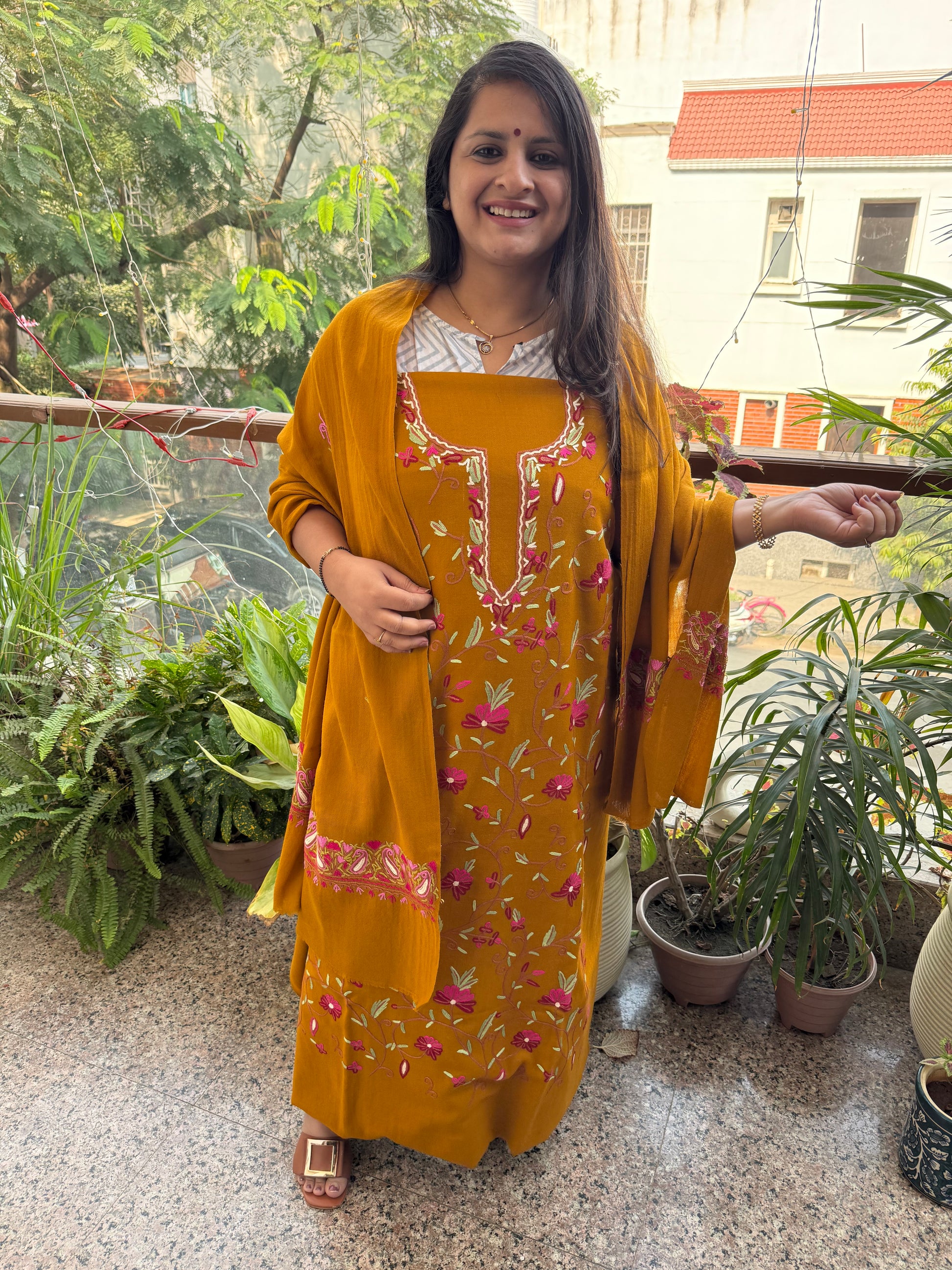 OCHRE YELLOW THREE PIECE JAL EMBROIDERED WORK MERINO WOOL UNSTITCHED SUIT SET WITH HAND EMBROIDERY (AARI WORK / SOZNI) WS -5