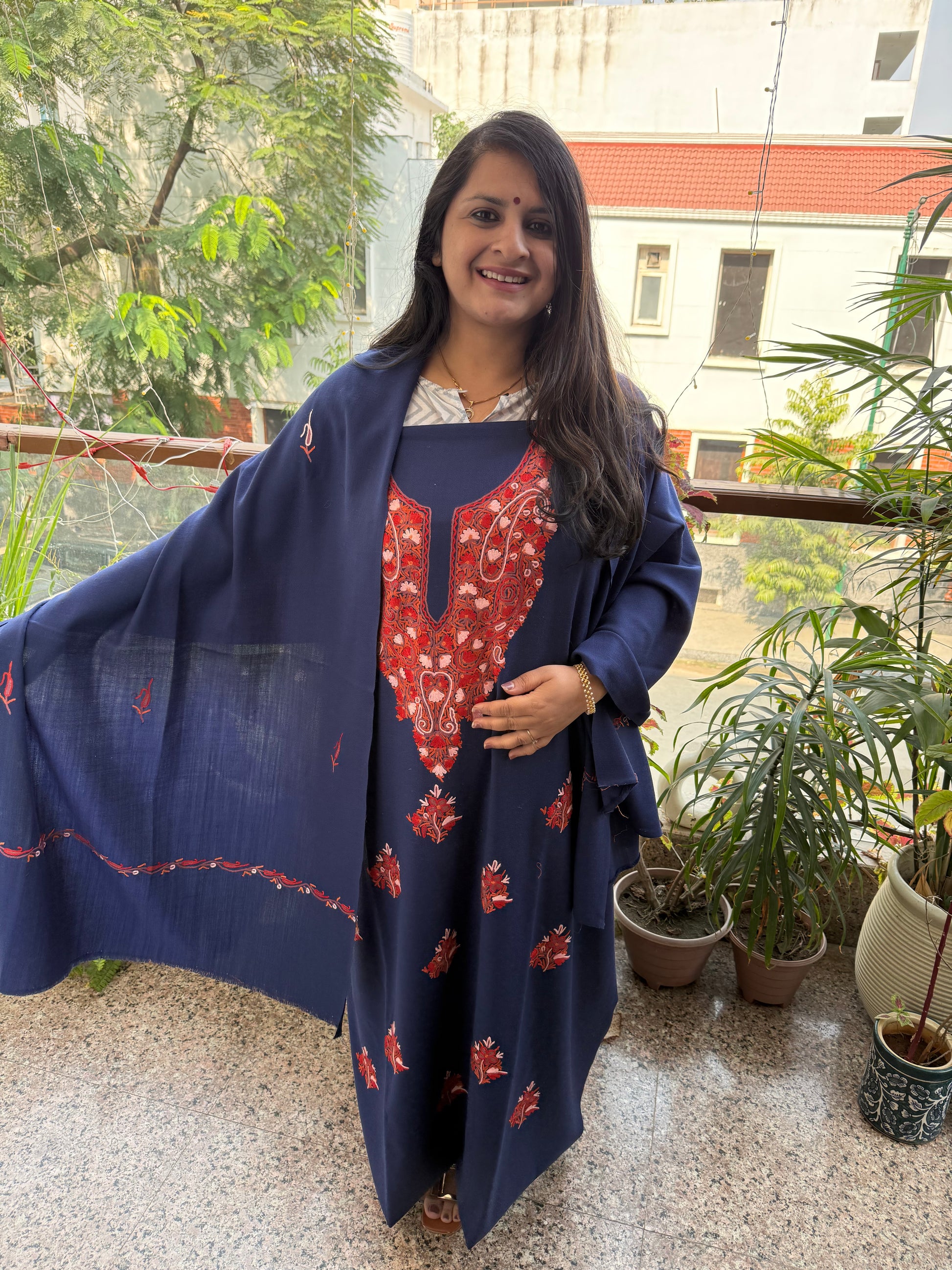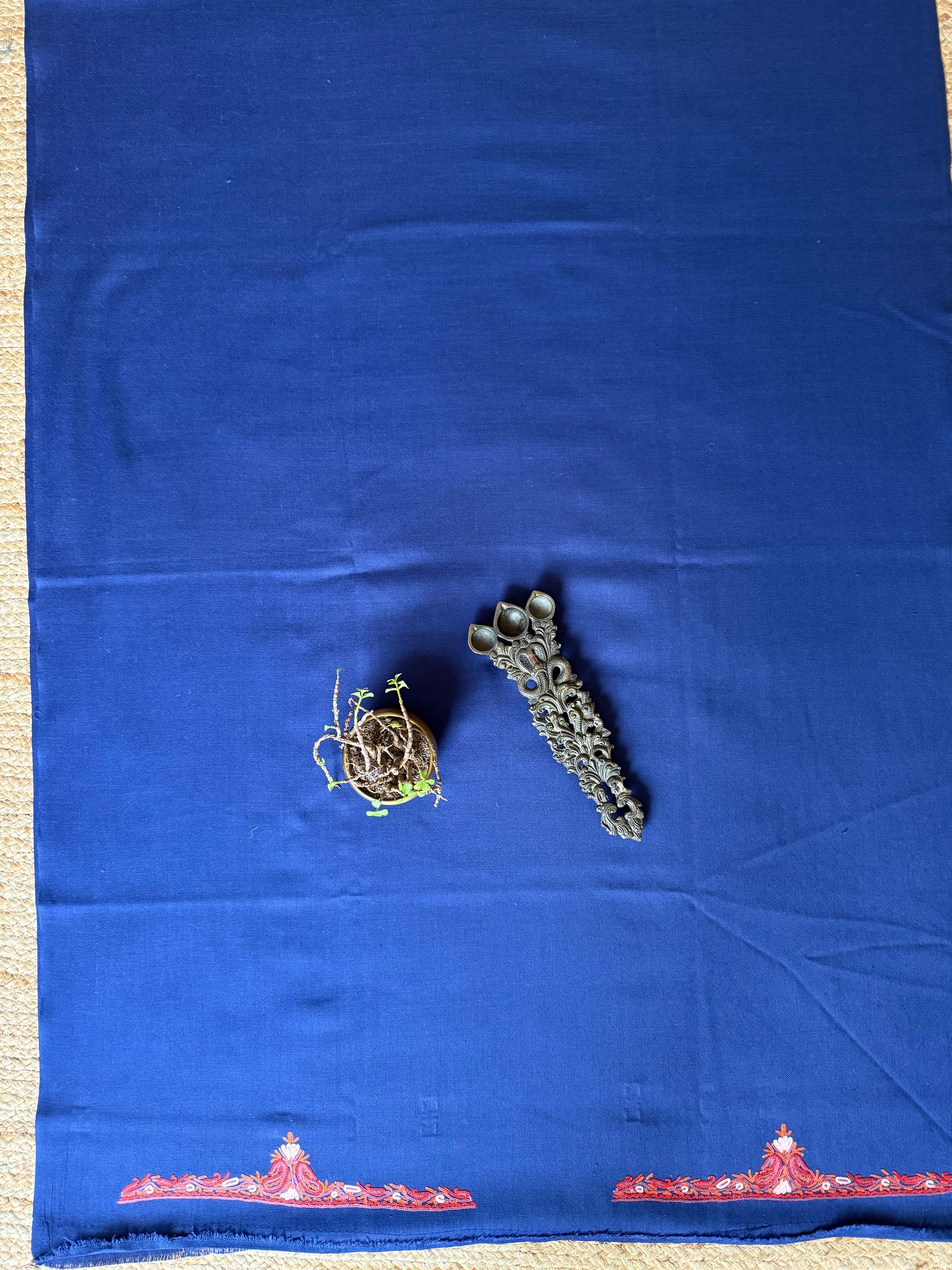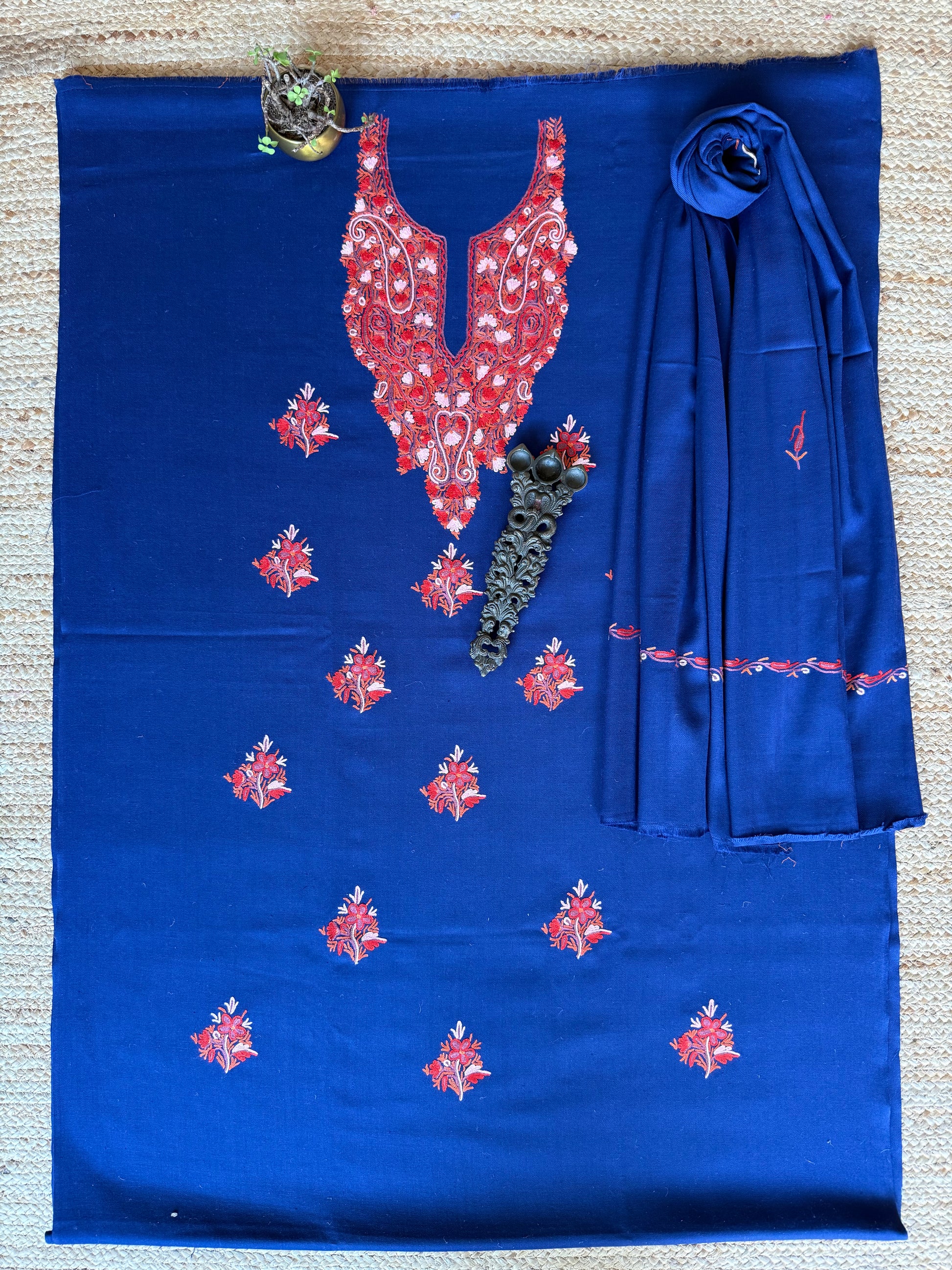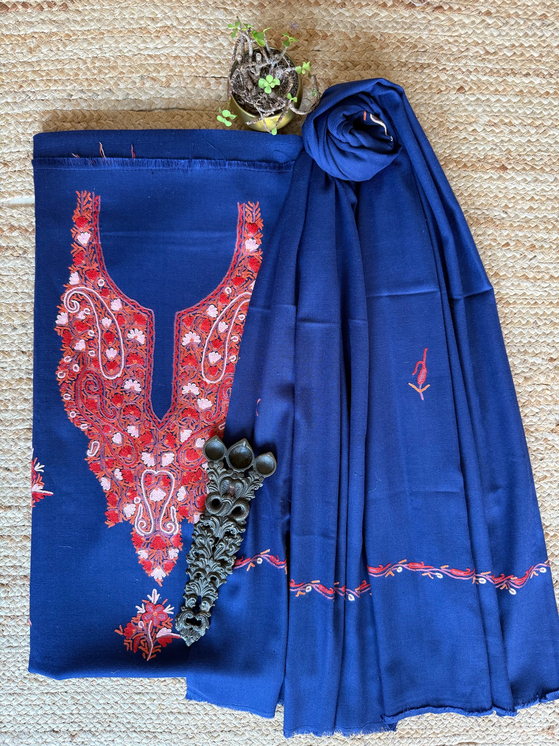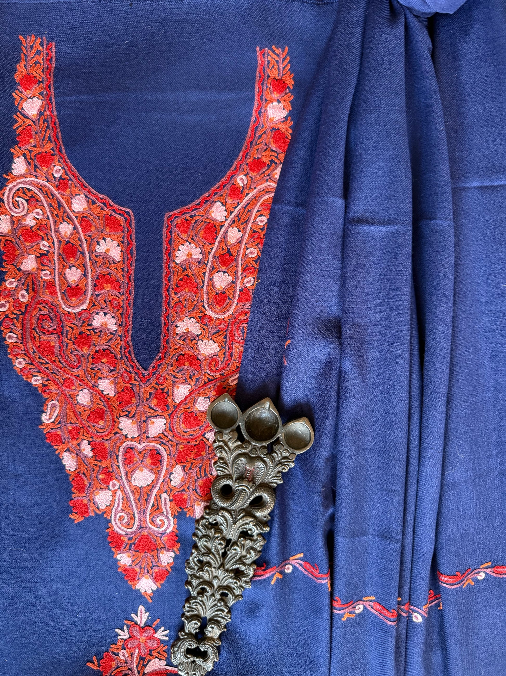 NAVY BLUE THREE PIECE EMBROIDERED WORK MERINO WOOL UNSTITCHED SUIT SET WITH HAND EMBROIDERY (AARI WORK / SOZNI) WS -3