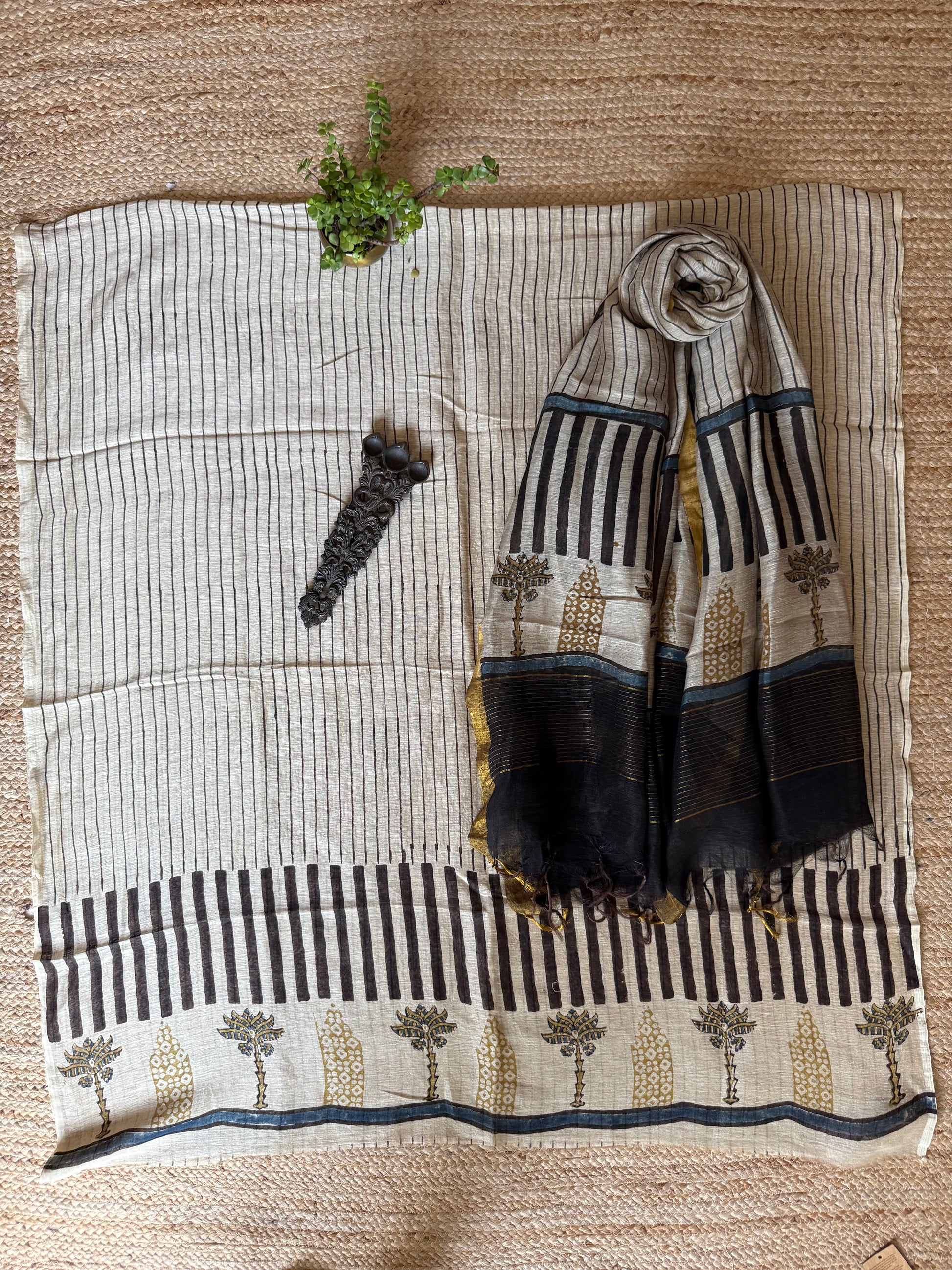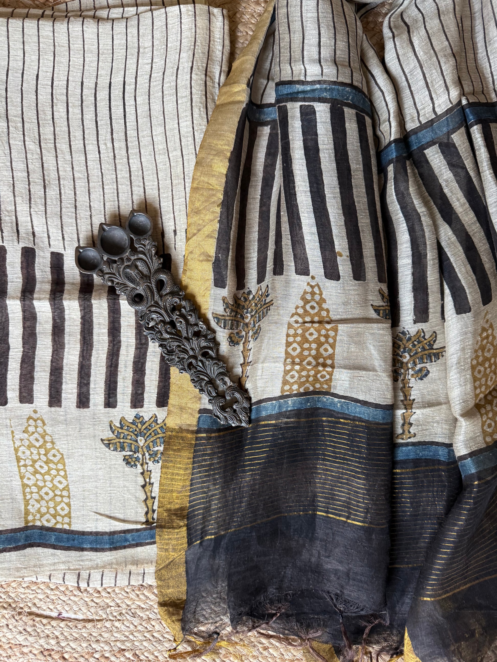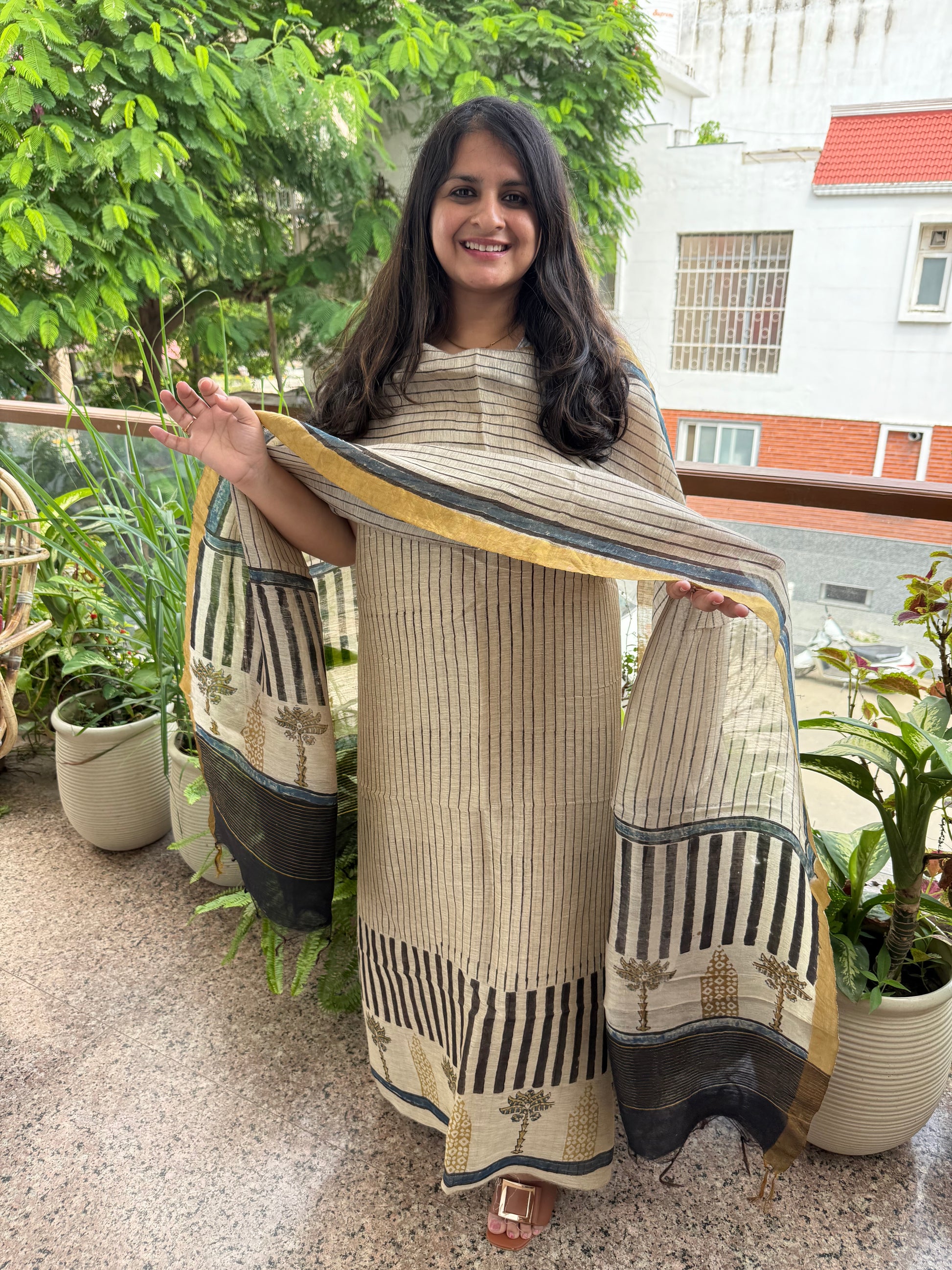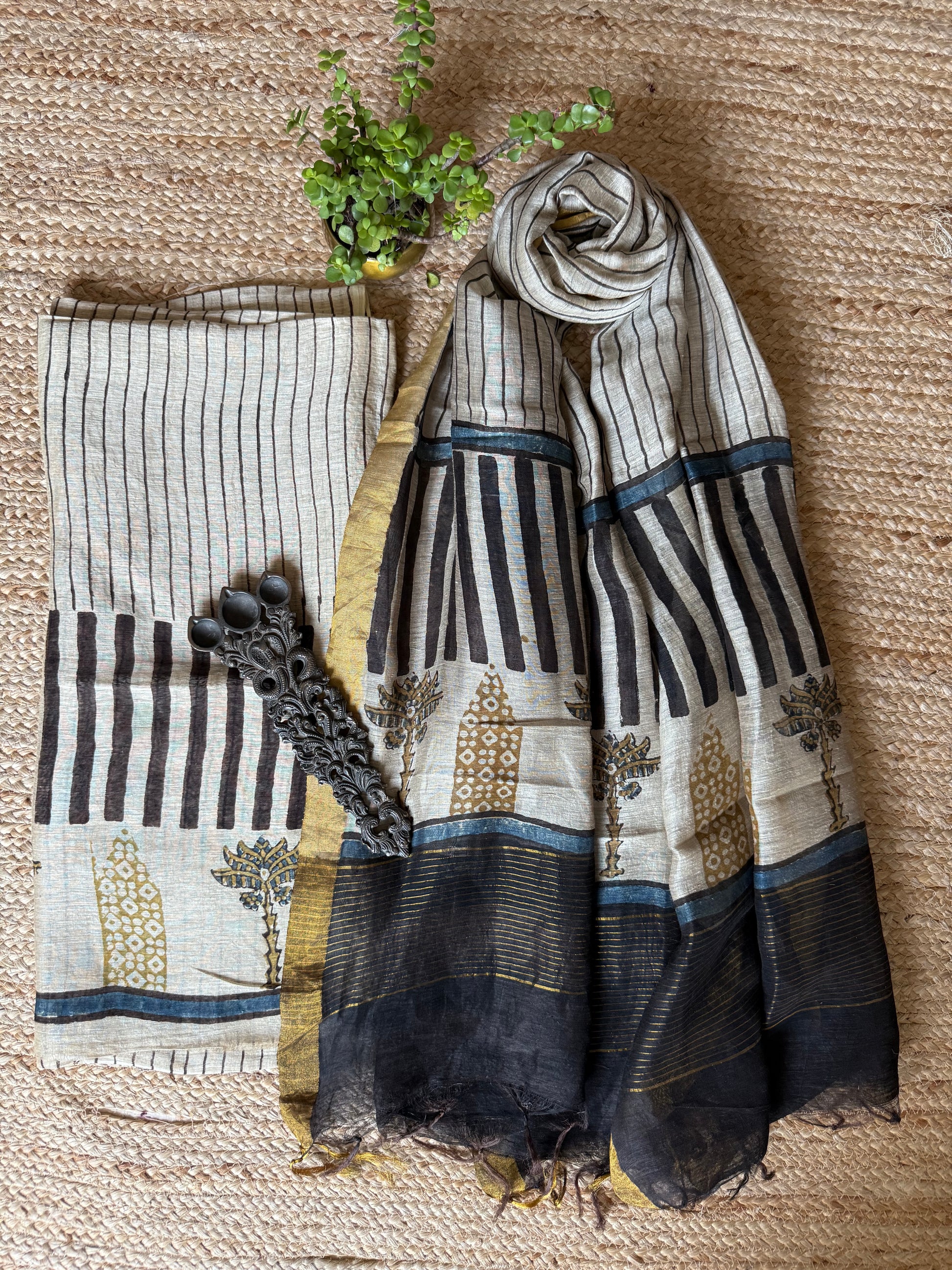 BEIGE LINEN AJRAKH SILK HANDBLOCK SUIT SET AL-108