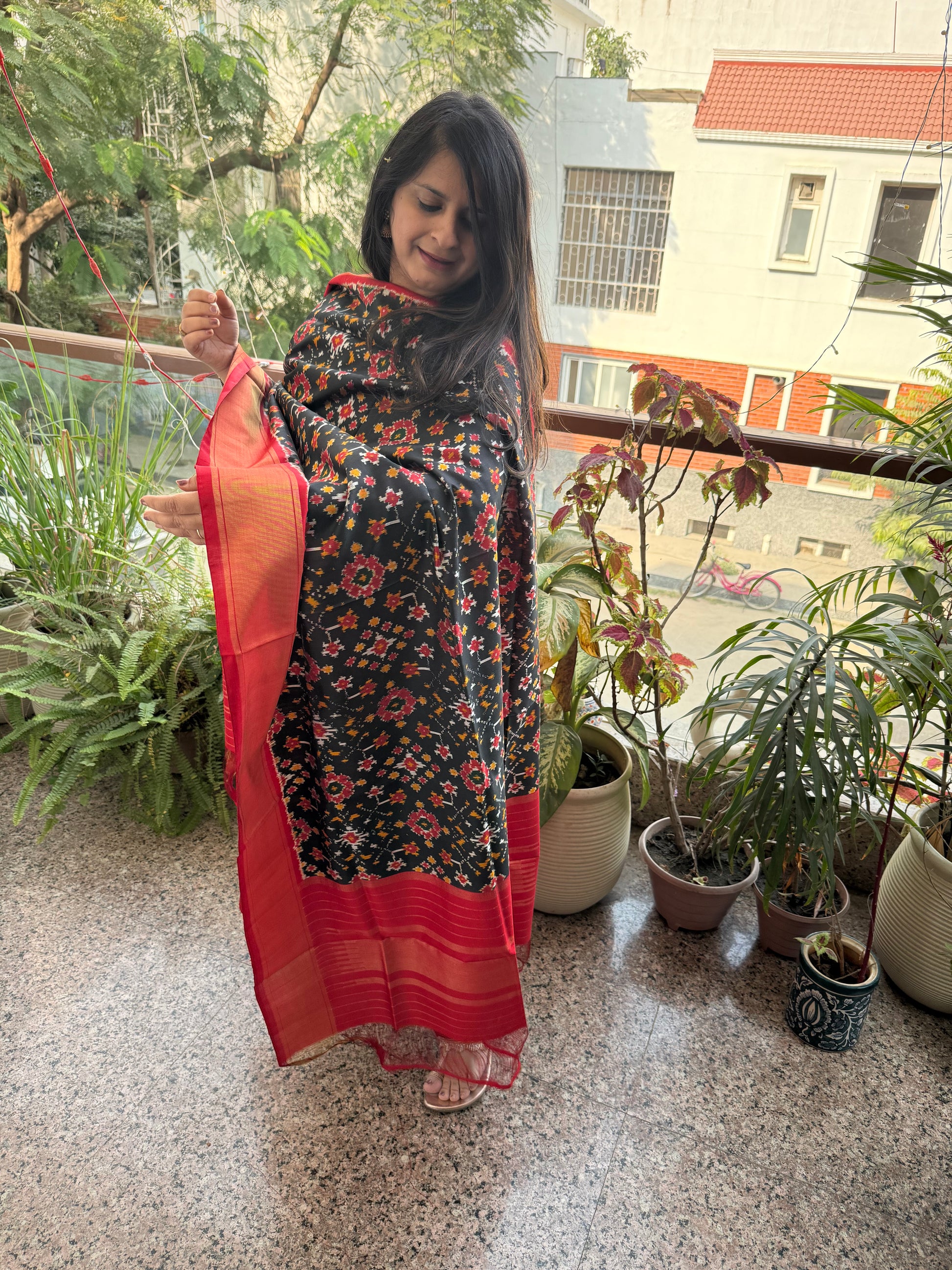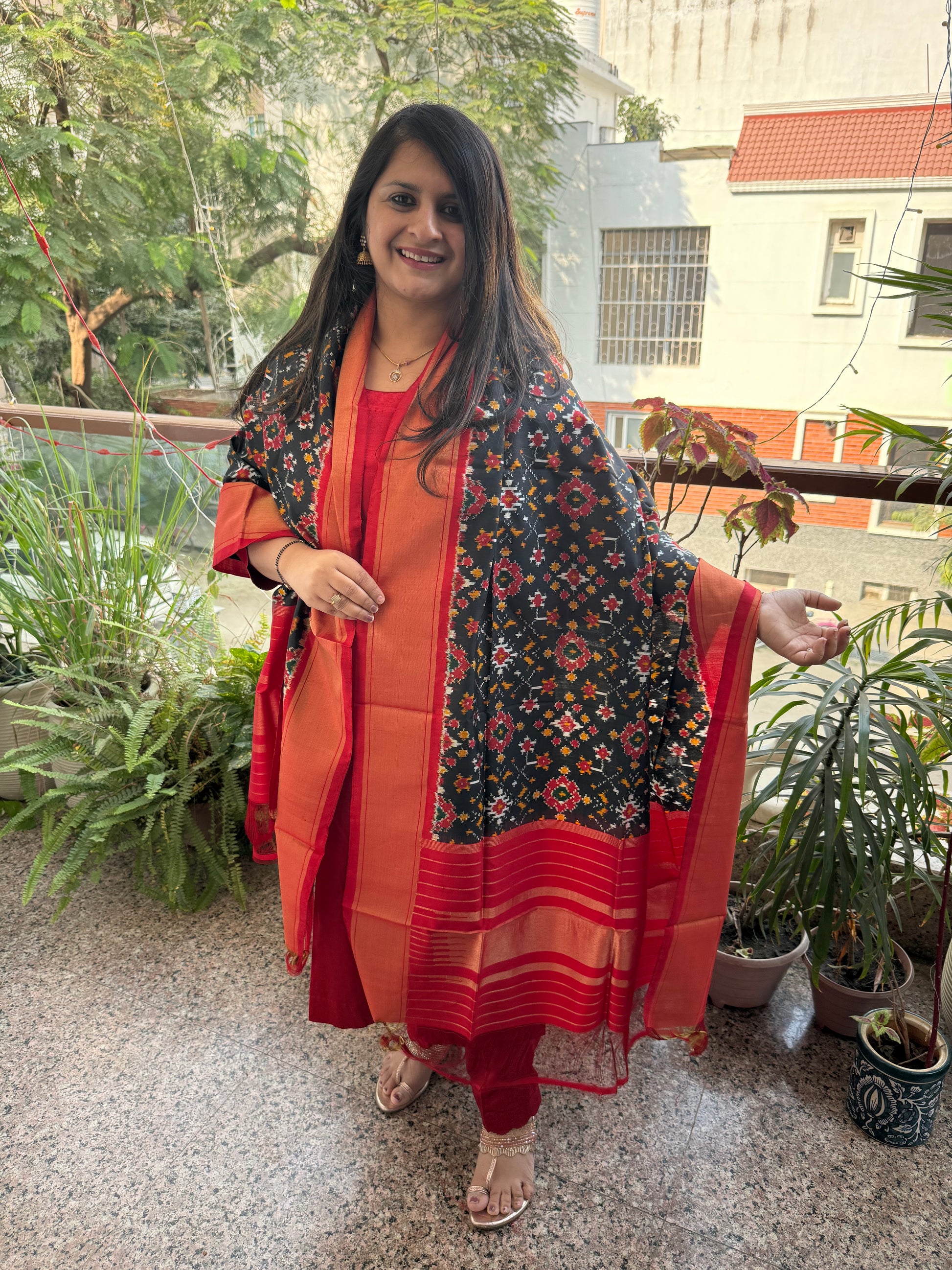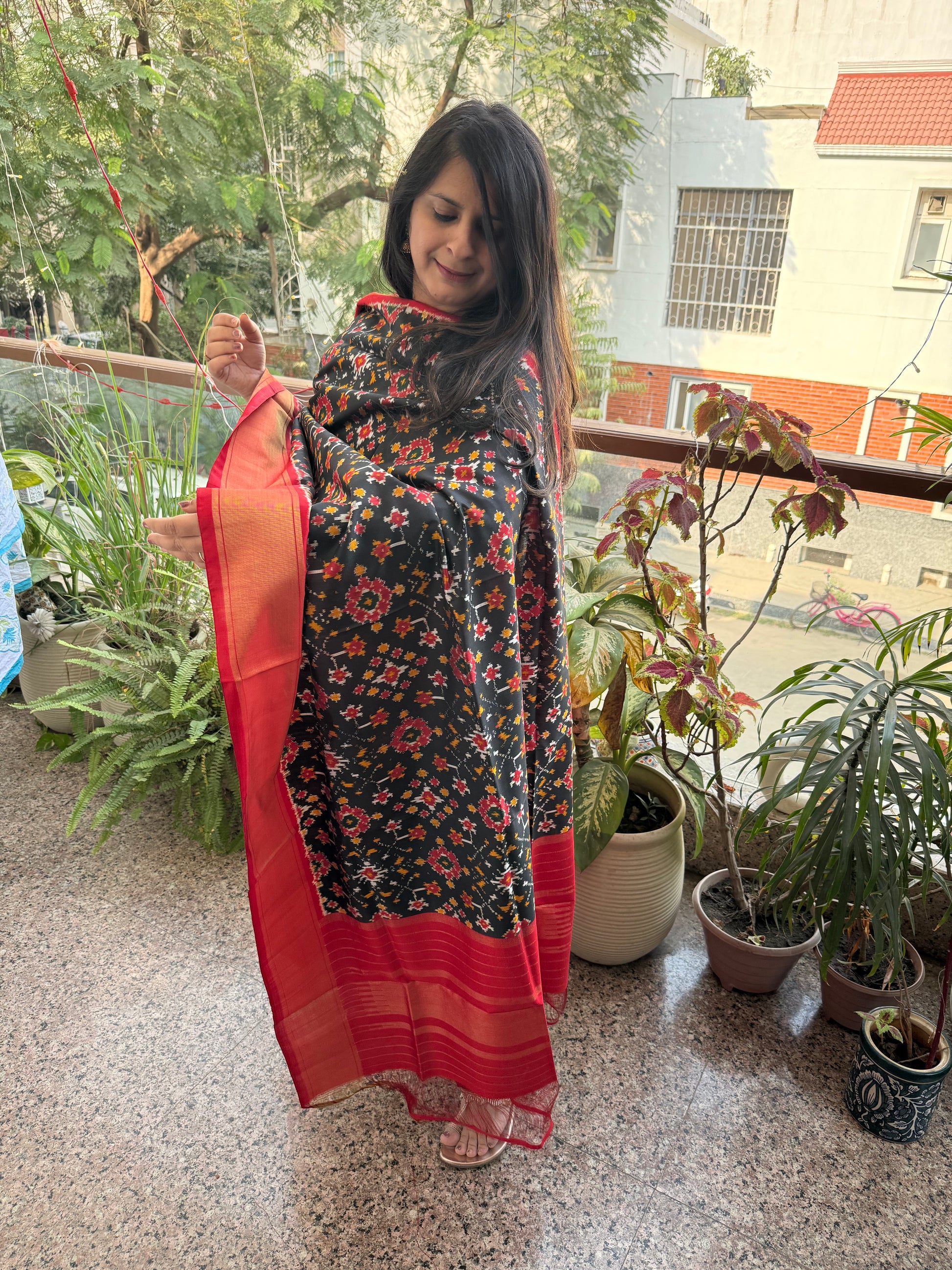 Black handspan handwoven ikat silk dupatta from state of Telangana..