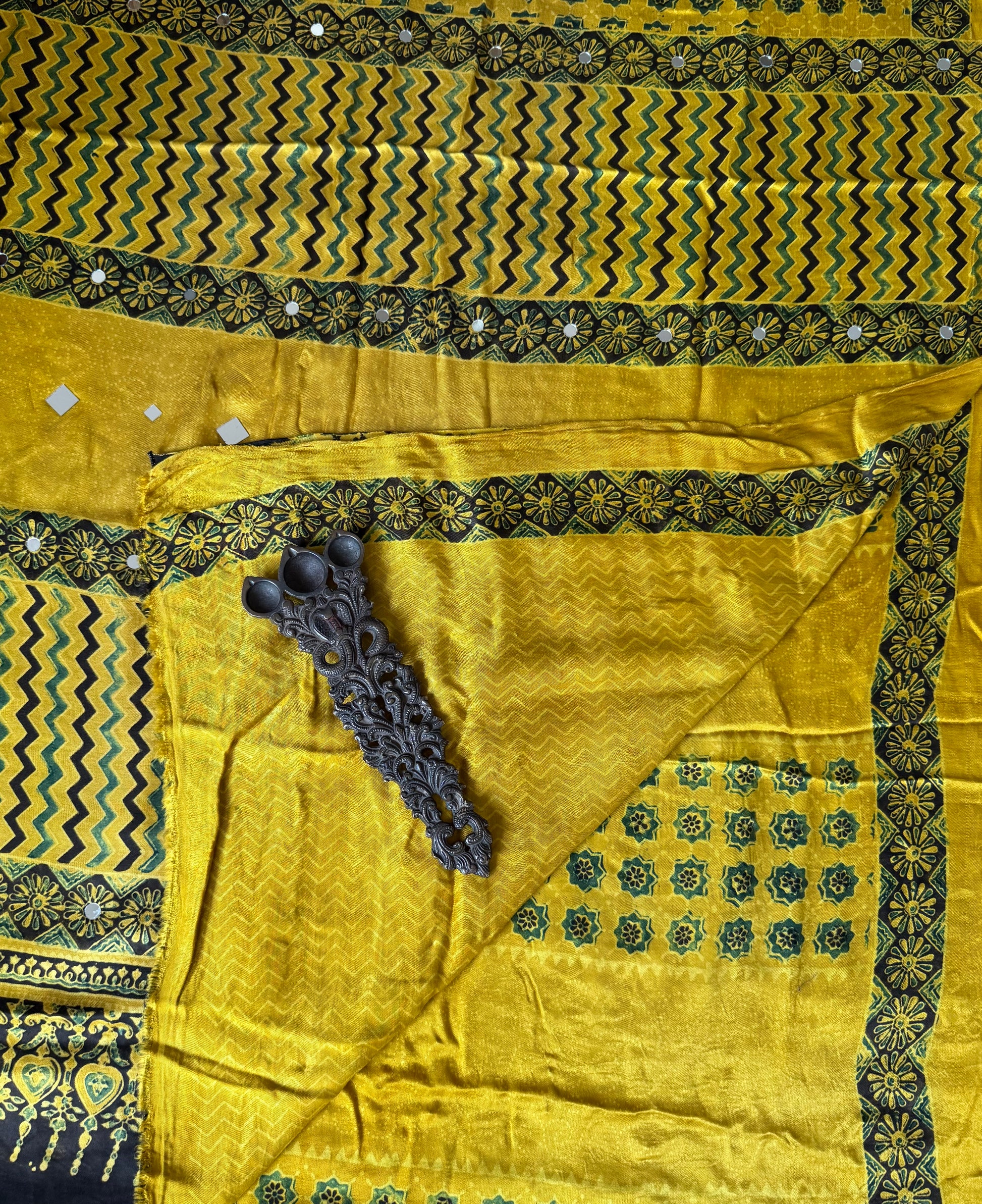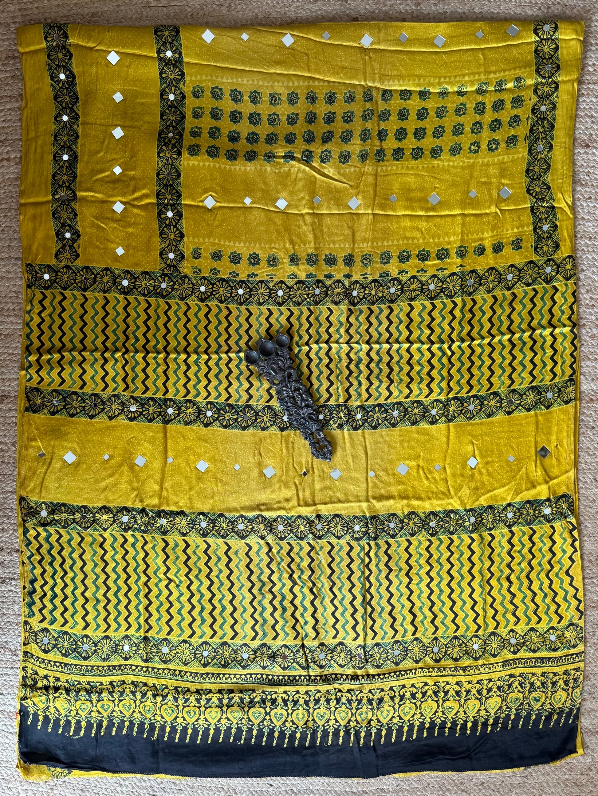 MUSTARD YELLOW AJRAKH HANDCRAFTED MIRROR WORK MODAL SILK SARI WITH ZARI PALLA WITH BLOUSE PIECE SIZE: 6.3MTRS