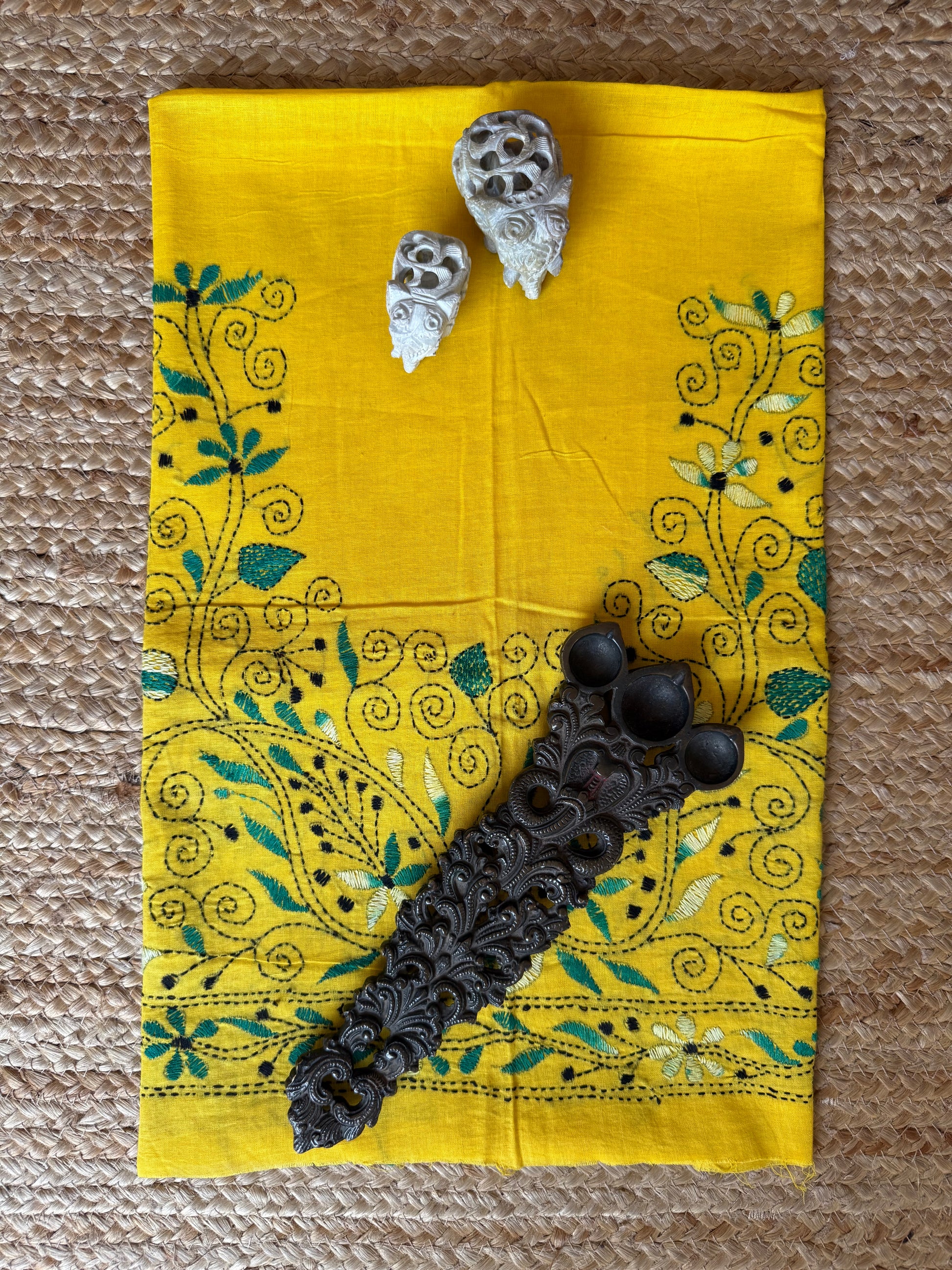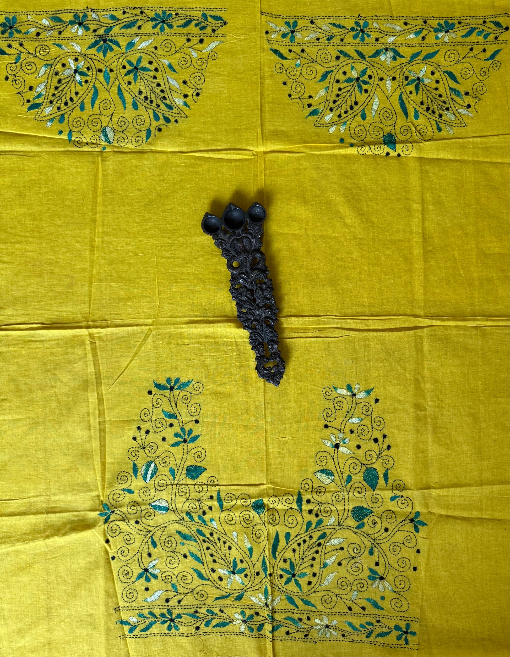 BRIGHT YELLOW COTTON SILK KANTHA WORK UNSTITCHED BLOUSE PIECE