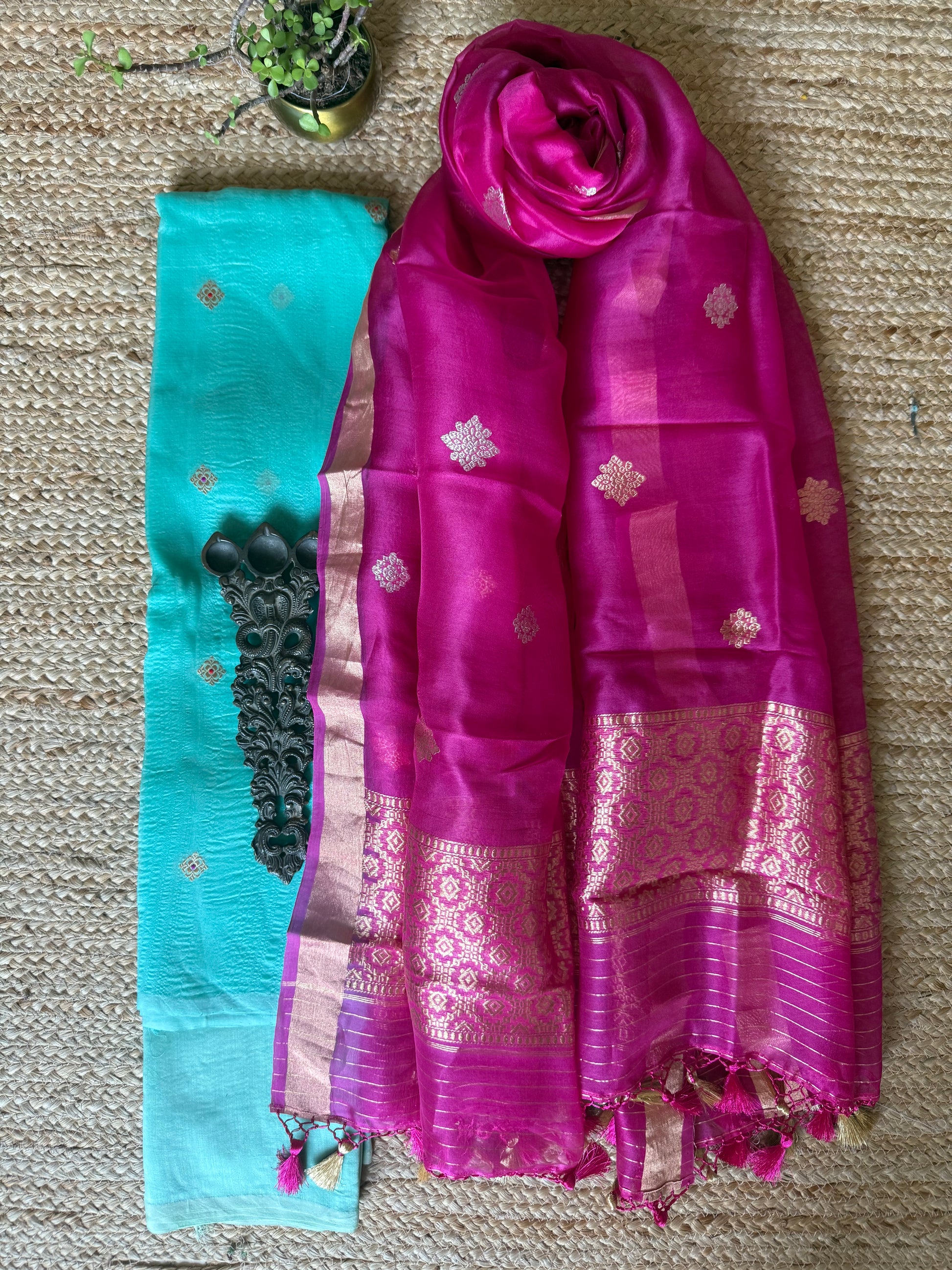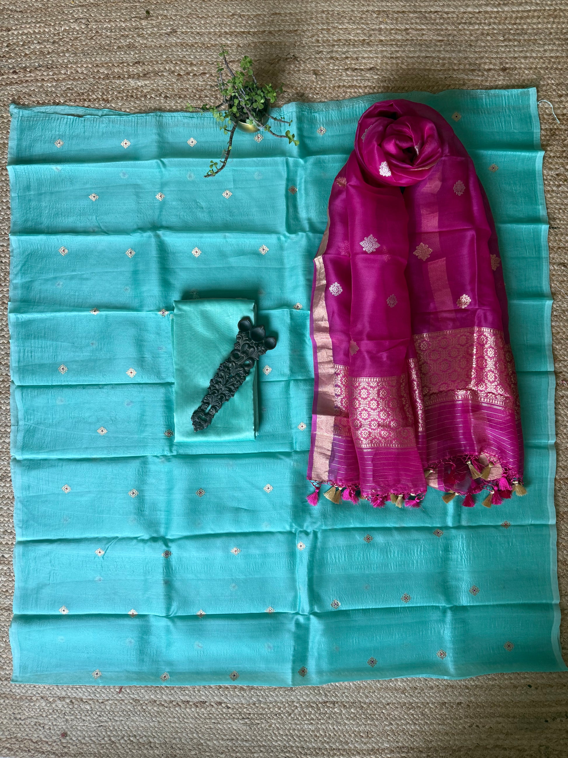 Turquoise Blue Kora silk certified handloom Banarsi kadwa Booti three piece suit