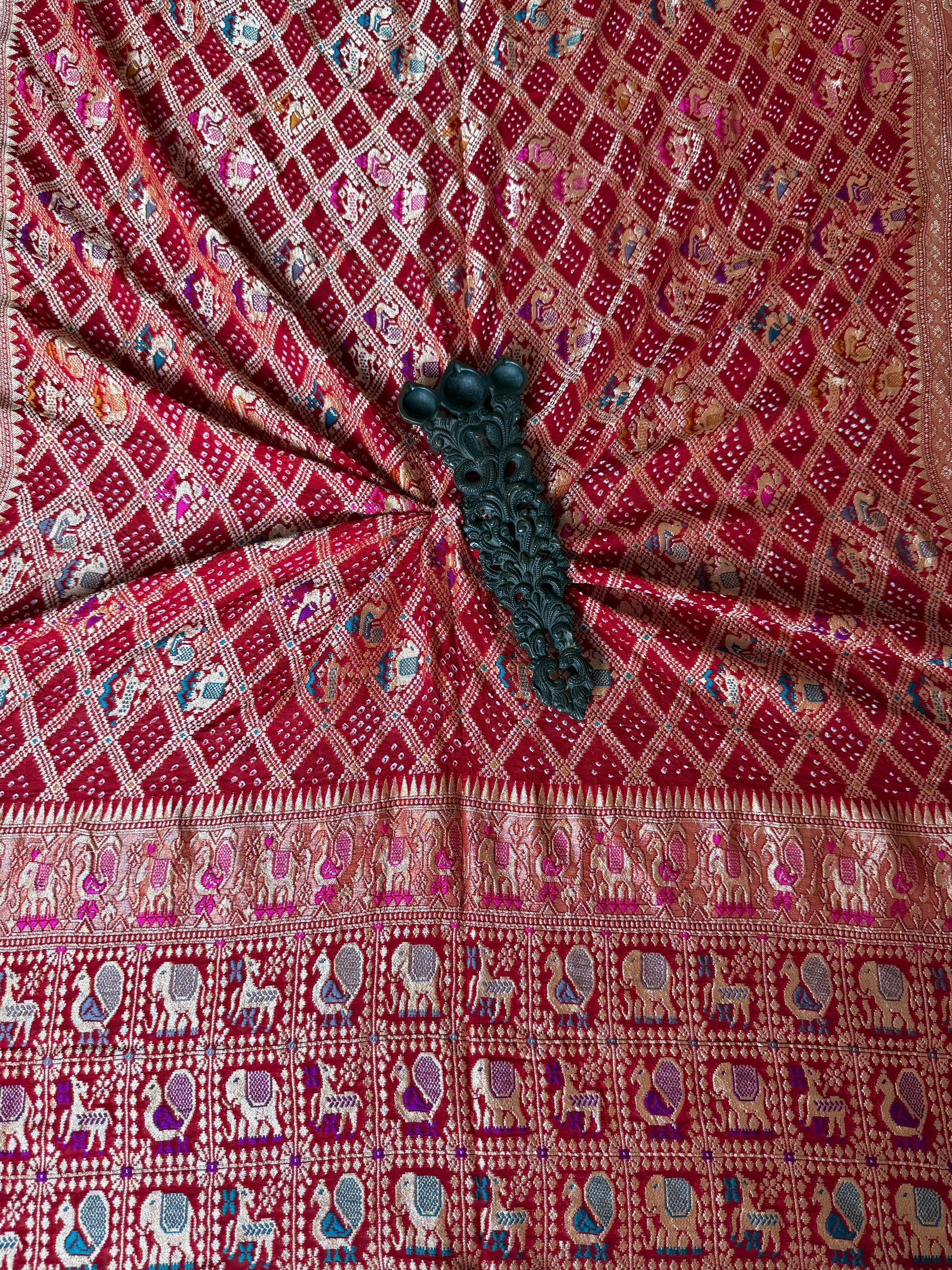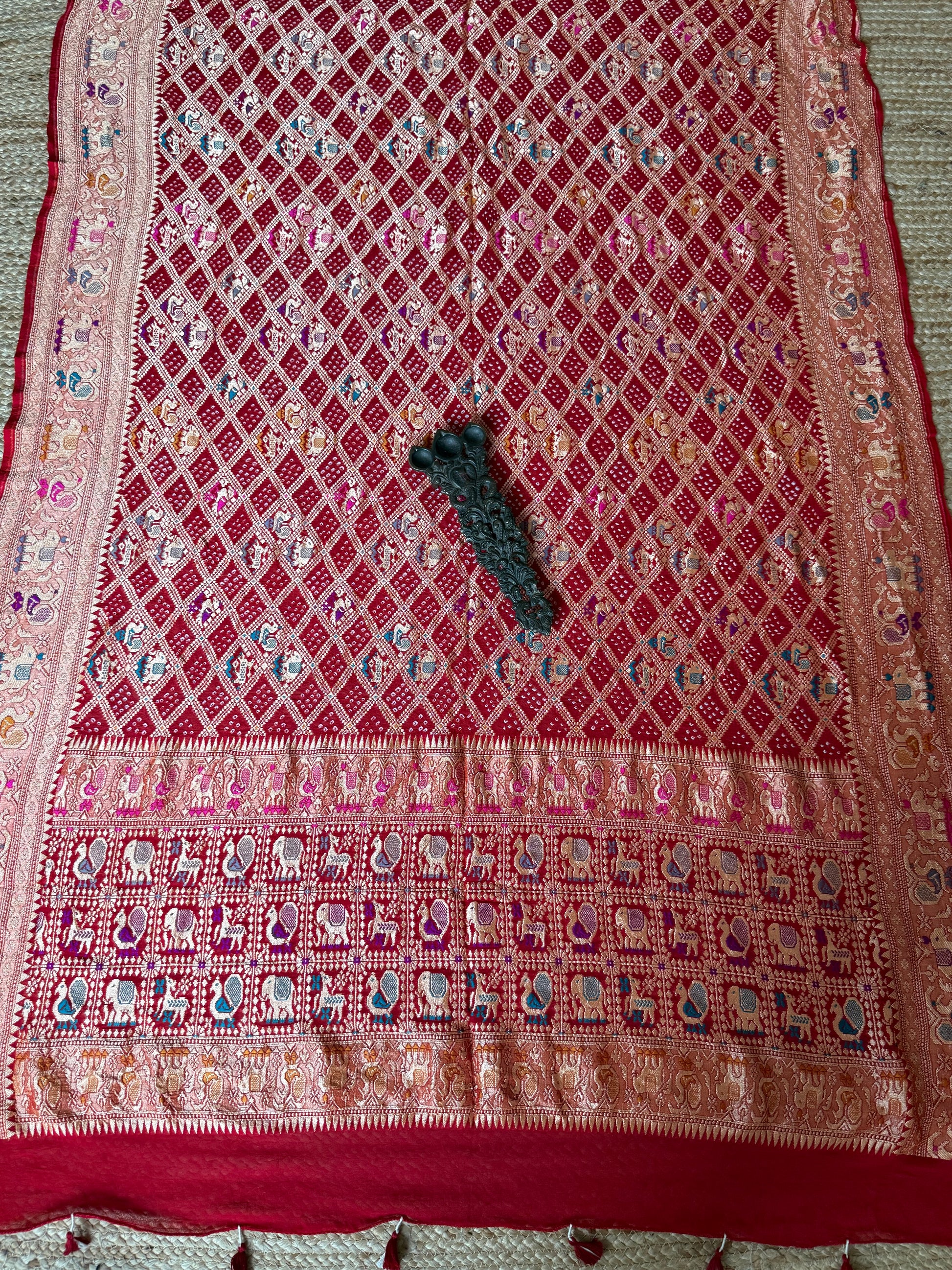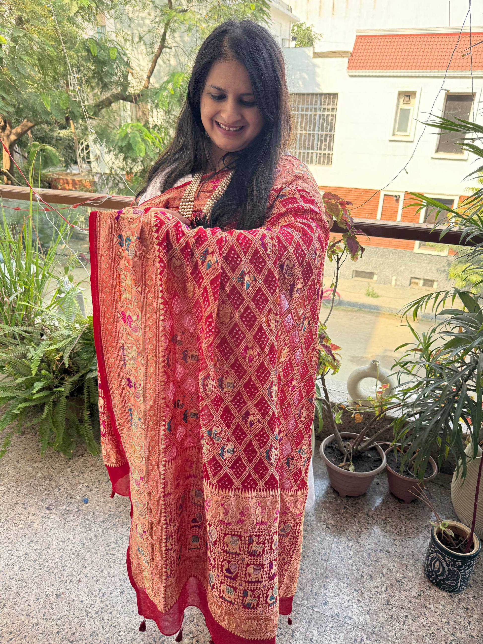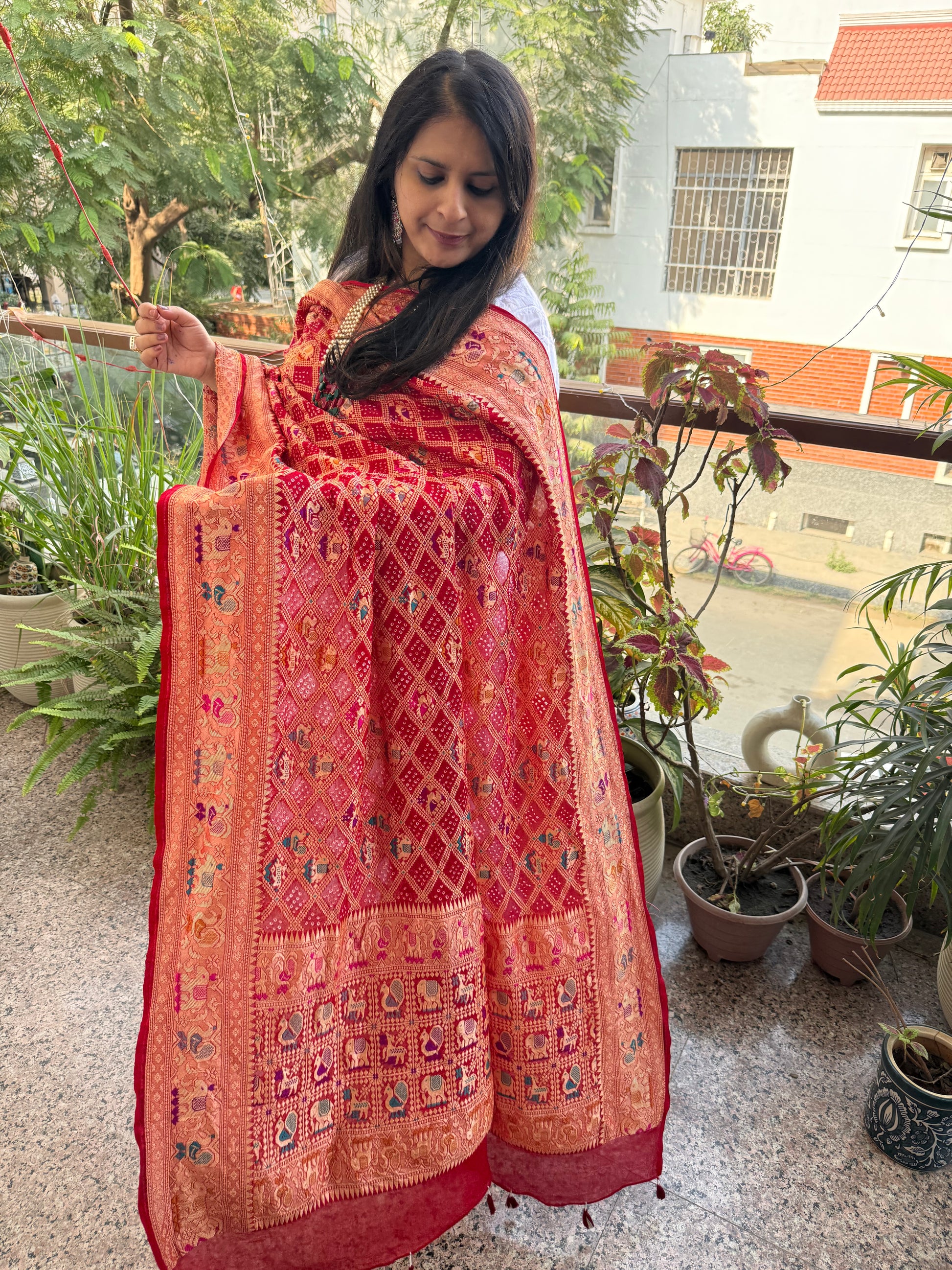 Red Handwoven Bareek Bandhani in Meenakari Jaal Premium Georgette dupatta