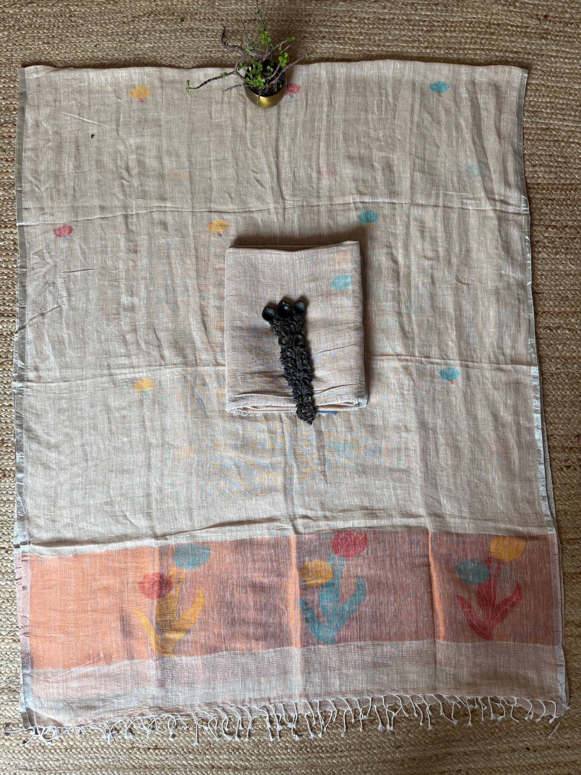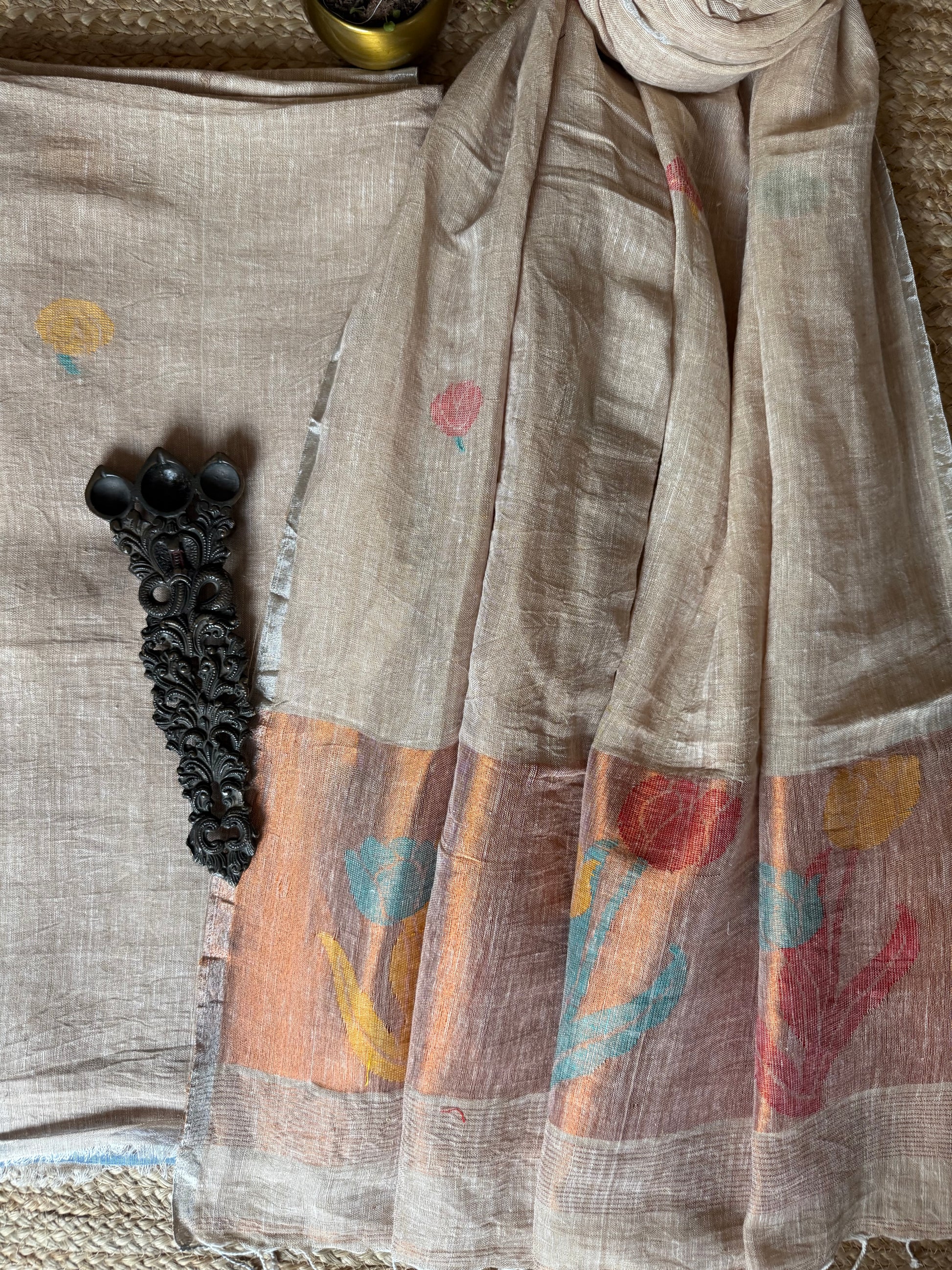 | BEIGE COPPER JAMDANI WOVEN LINEN KURTA SET WITH HAND EMBROIDERY JAMDANI DUPATTA