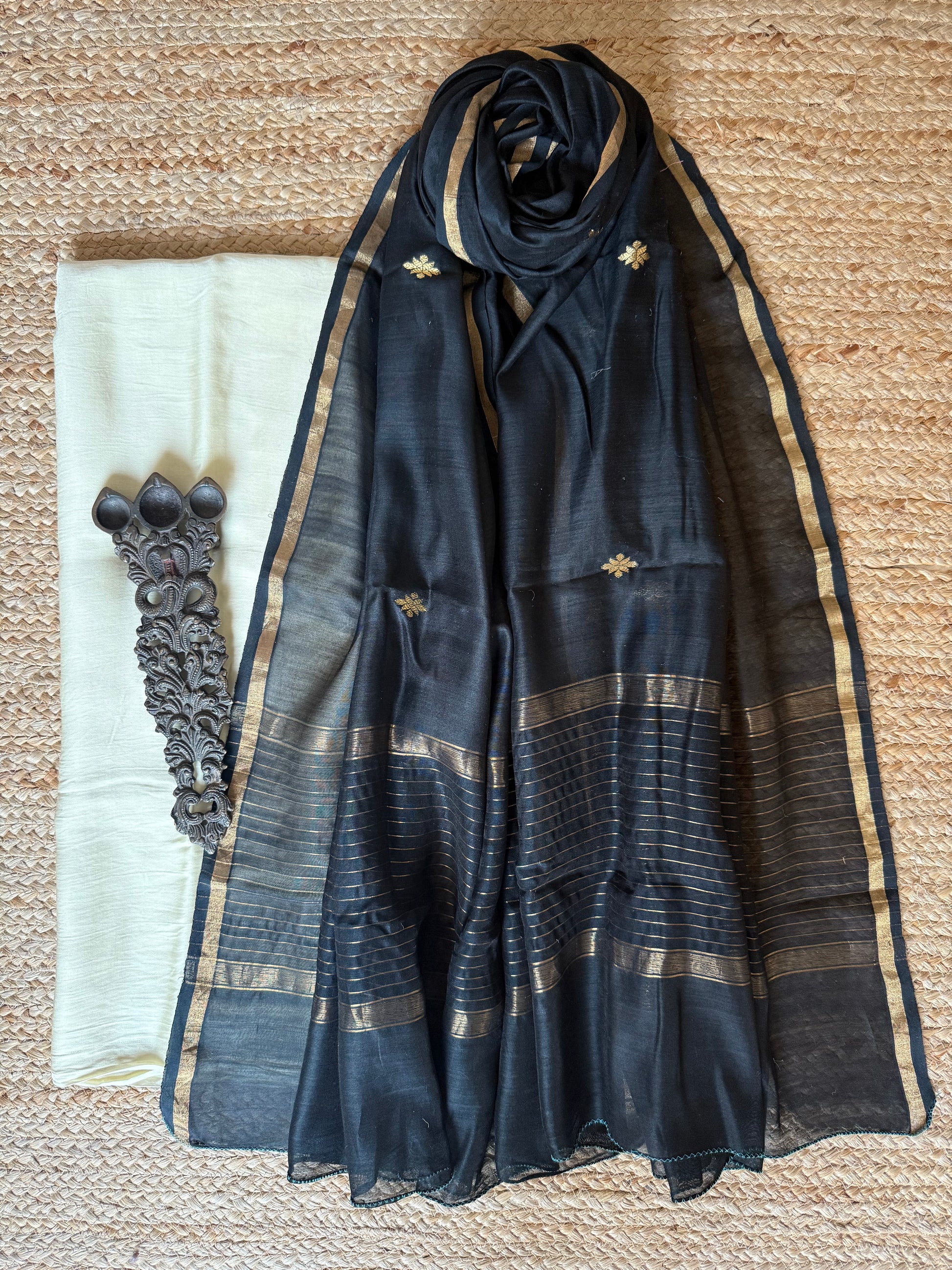 | BEIGE GOLDEN MUGA SILK KURTA WITH CHANDERI HANDLOOM DUPATTA fabric: 2.5 mtrs each (top & bottom) dupatta: 2.5 mtrs * 35'' a slight difference in shade could be due to the camera & lights. embrace the imperfection !! happy handloom dry clean only |