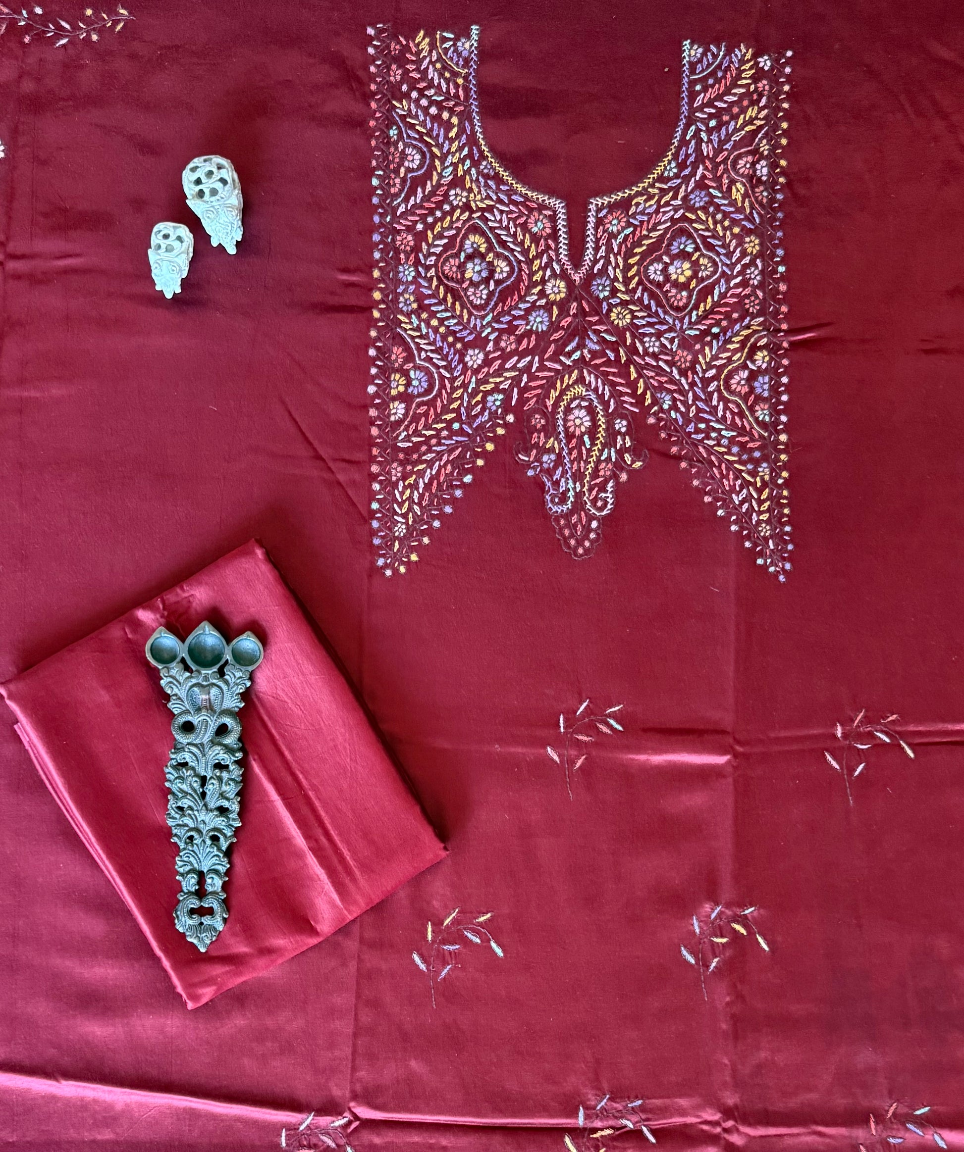 MAROON MASHRU SILK HAND EMBROIDERY KASHMIRI HAND EMBROIDERY SOZNI WORK CORD SET