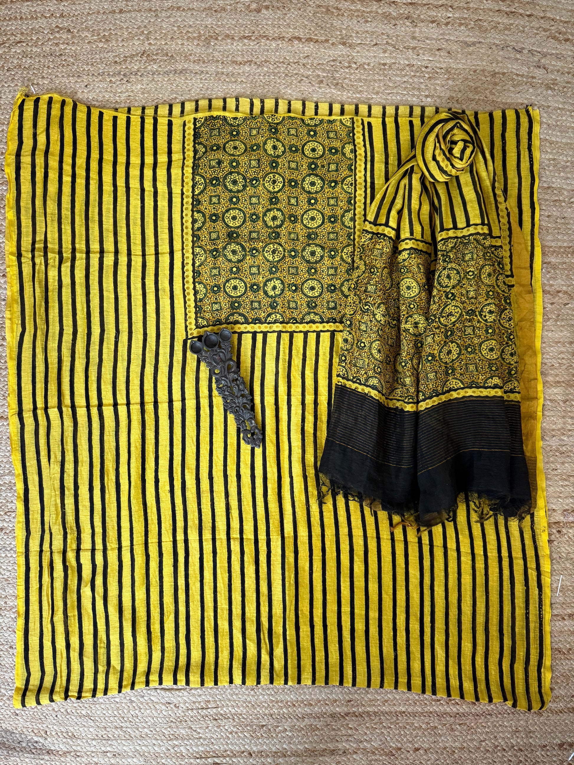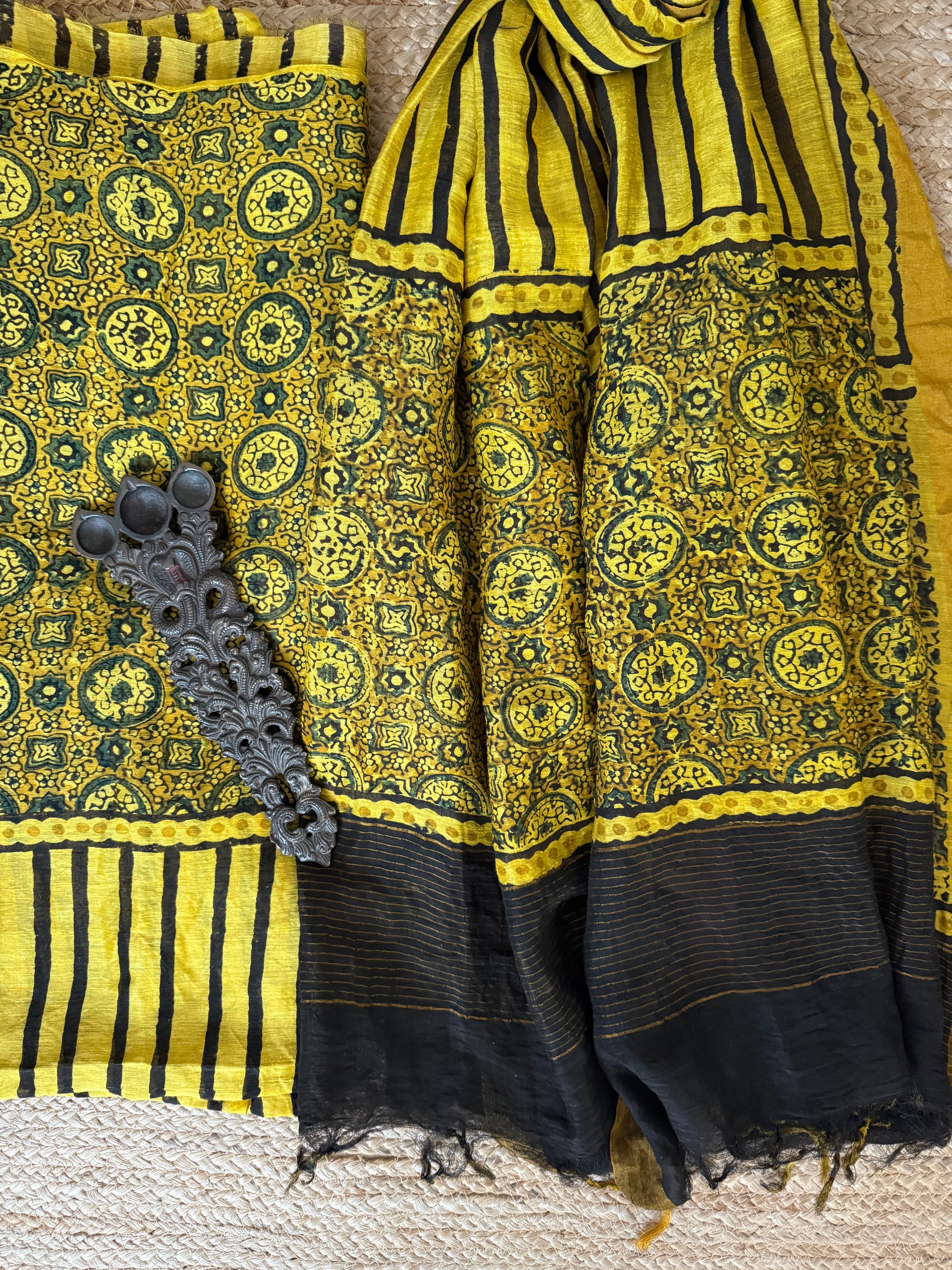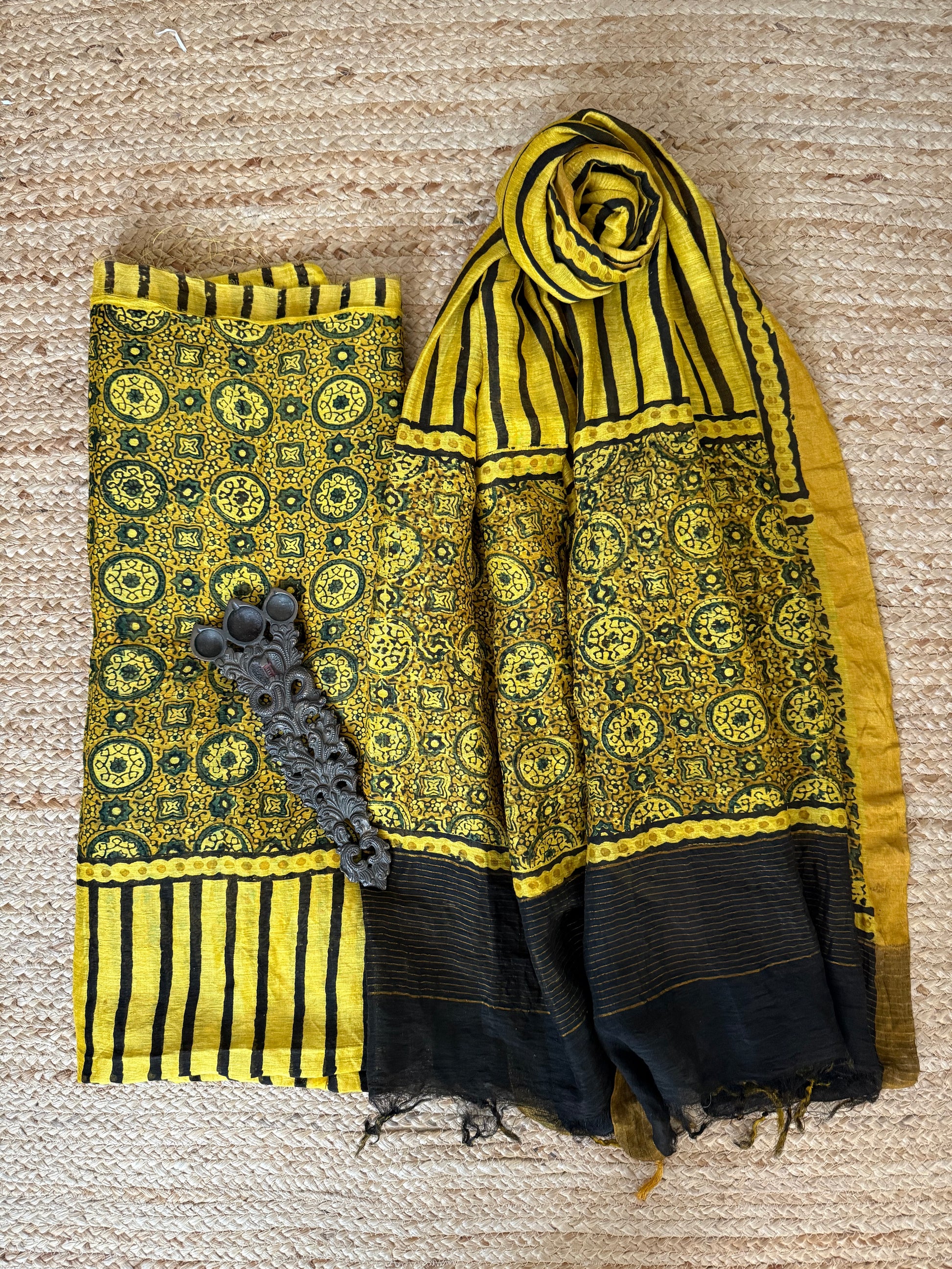 MUSTARD YELLOW AJRAKH LINEN SILK HANDBLOCK SUIT SET AL-303