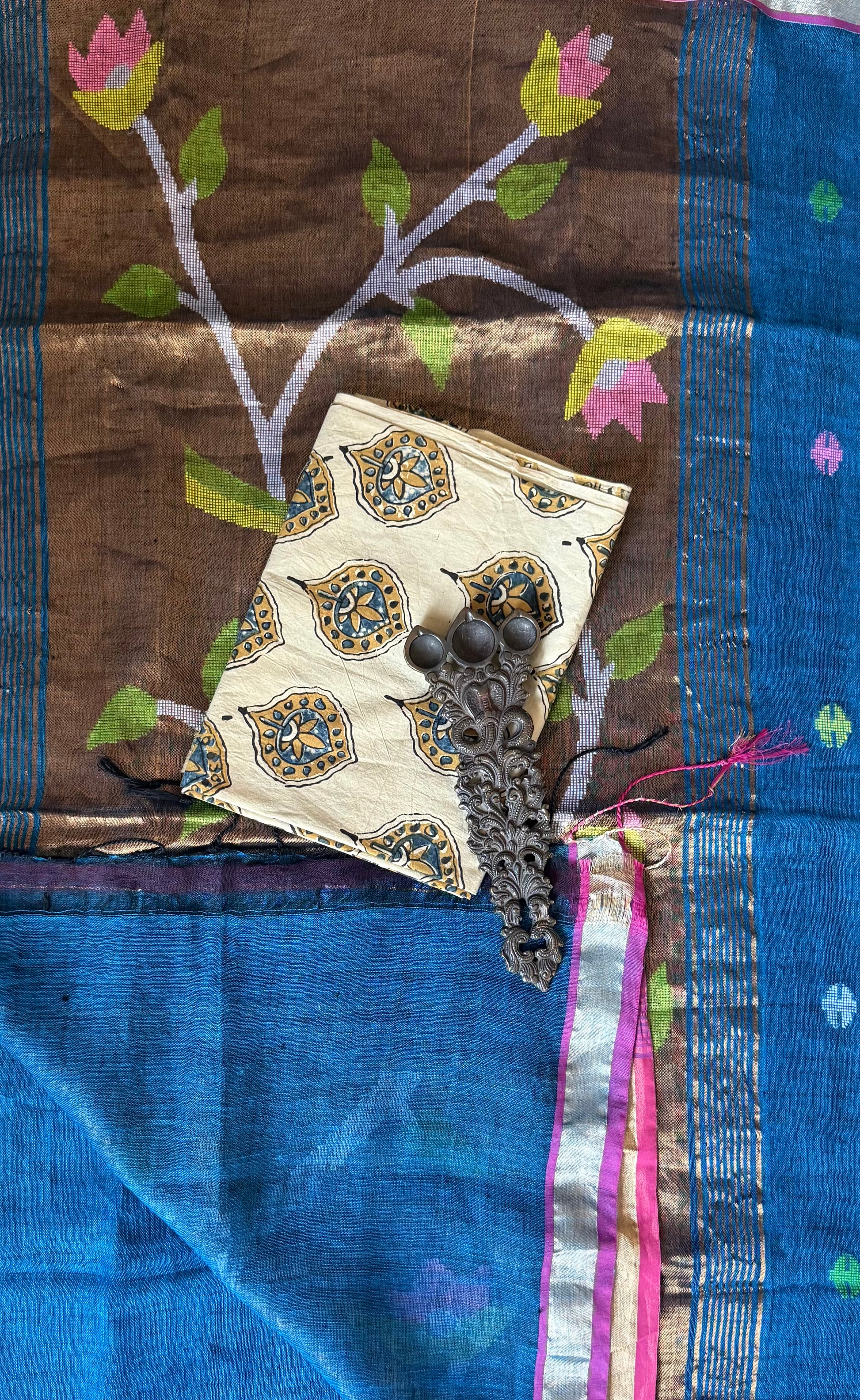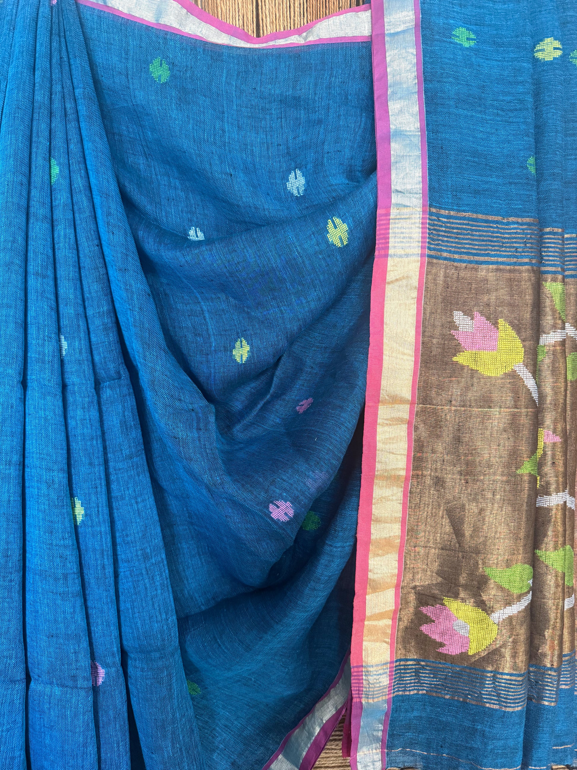 DENIM BLUE HANDWOVEN PURE LINEN SILK JAMDANI SARI WITH ZARI PALLU