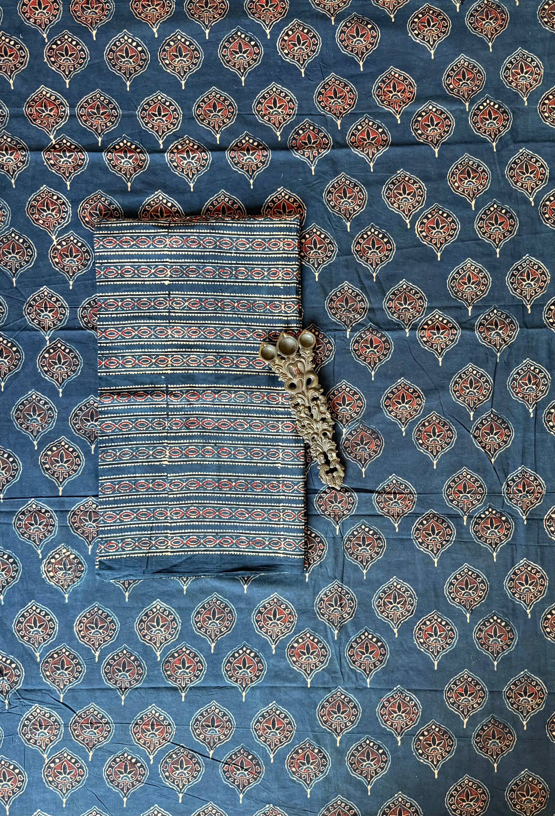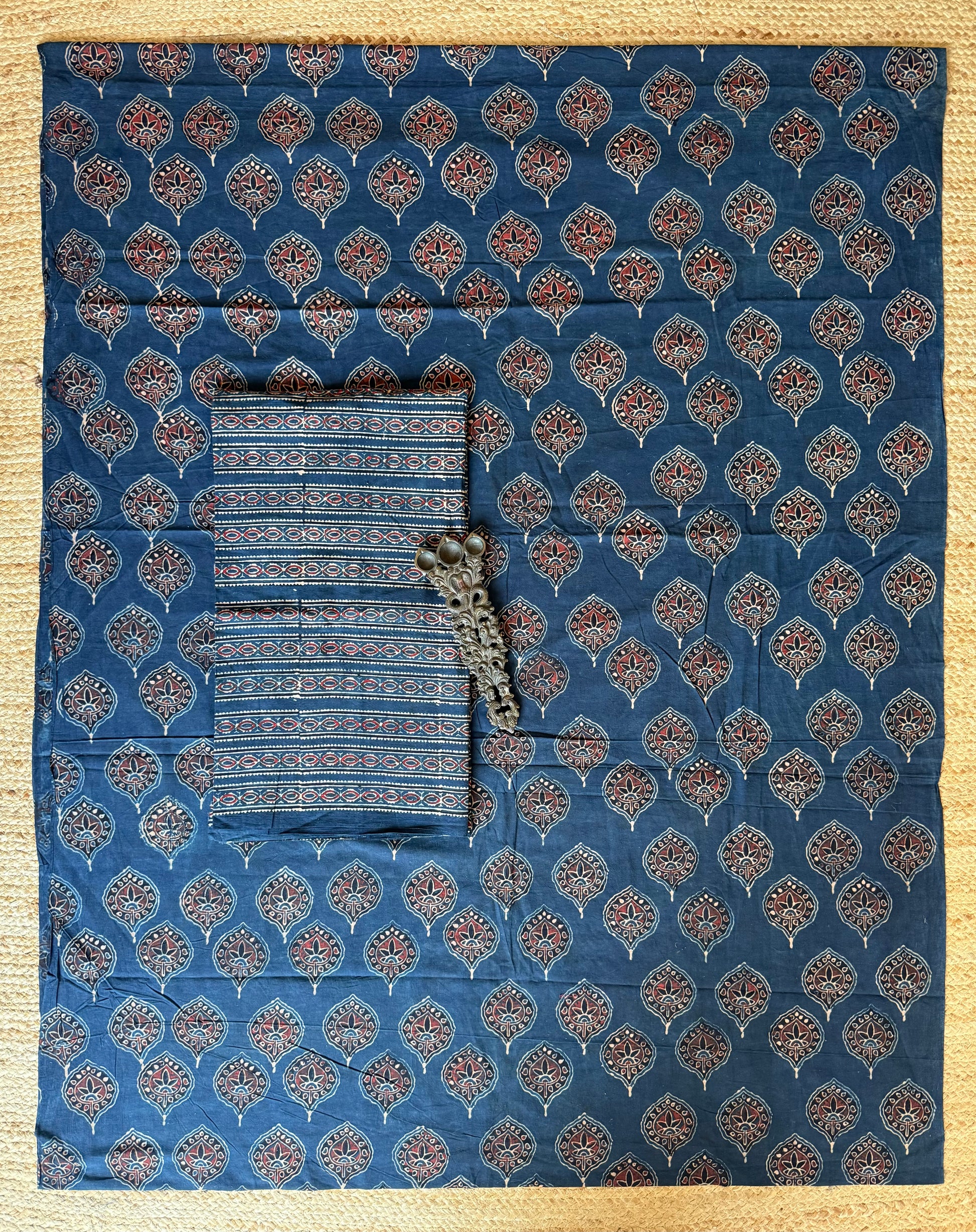 | INDIGO BLUE AJRAKH HANDCRAFTED COTTON SILK CORD SET FABRIC: 2.5 MTRS METER BOTTOM : 2.5 MTRS * 35'' A SLIGHT DIFFERENCE IN SHADE COULD BE DUE TO THE CAMERA & LIGHTS. EMBRACE THE IMPERFECTION !! HAPPY HANDLOOM DRY CLEAN ONLY |