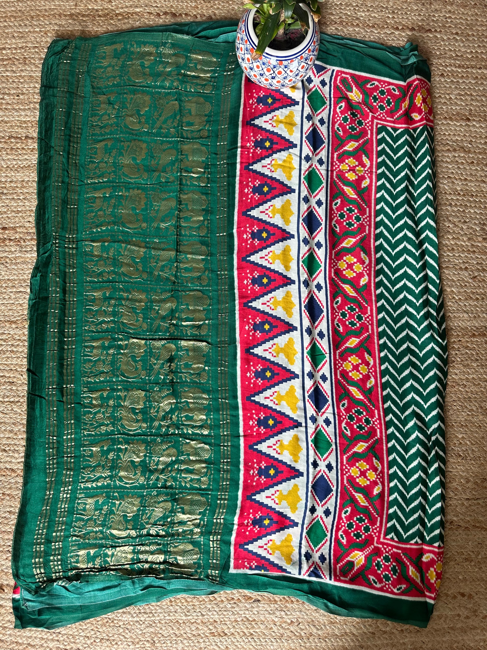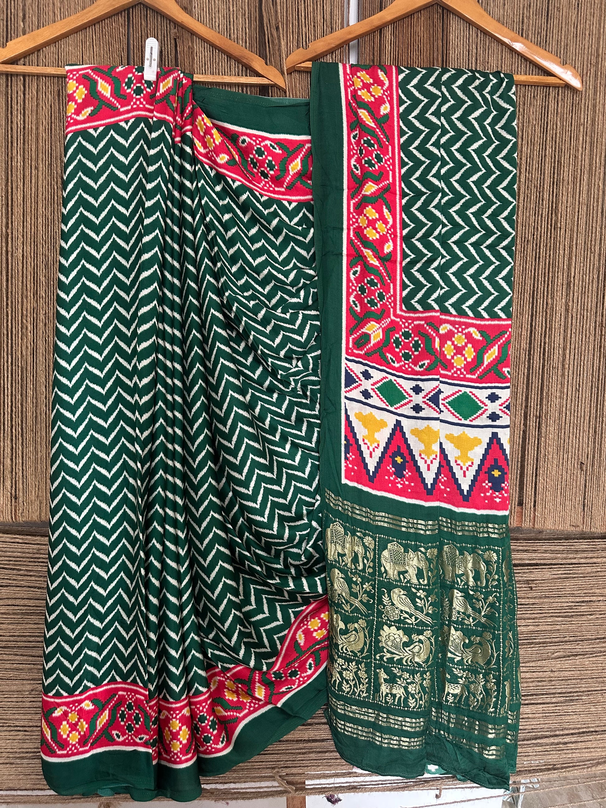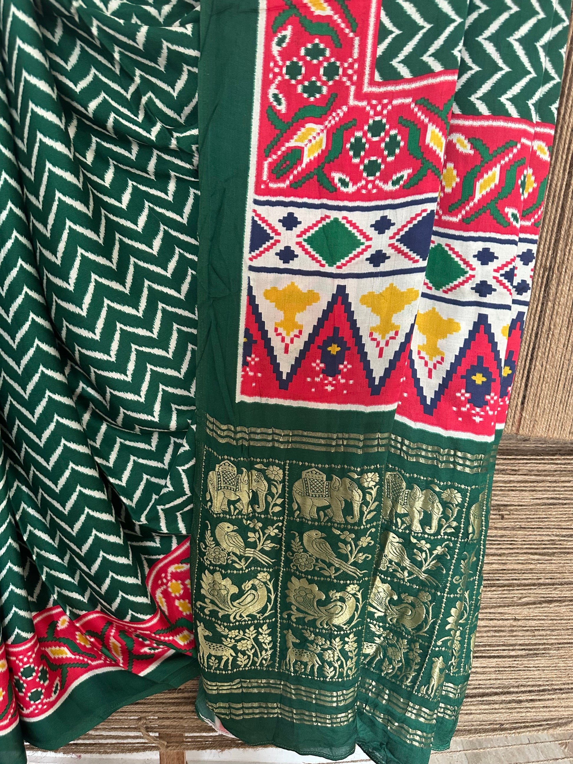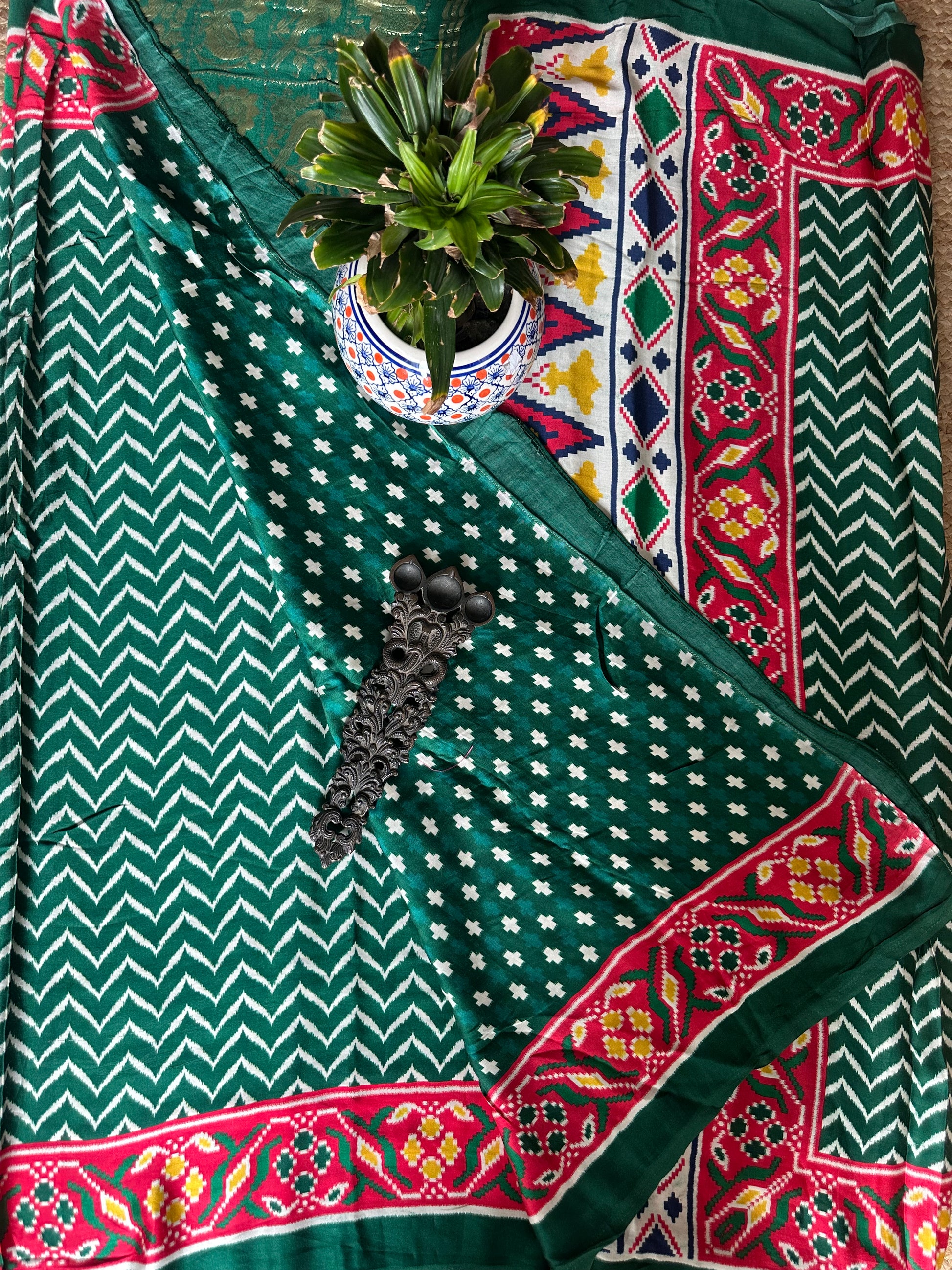 BOTTLE GREEN PATOLA MODAL SILK PATOLA PRINT SARI WITH ZARI BORDER PMS-10150
