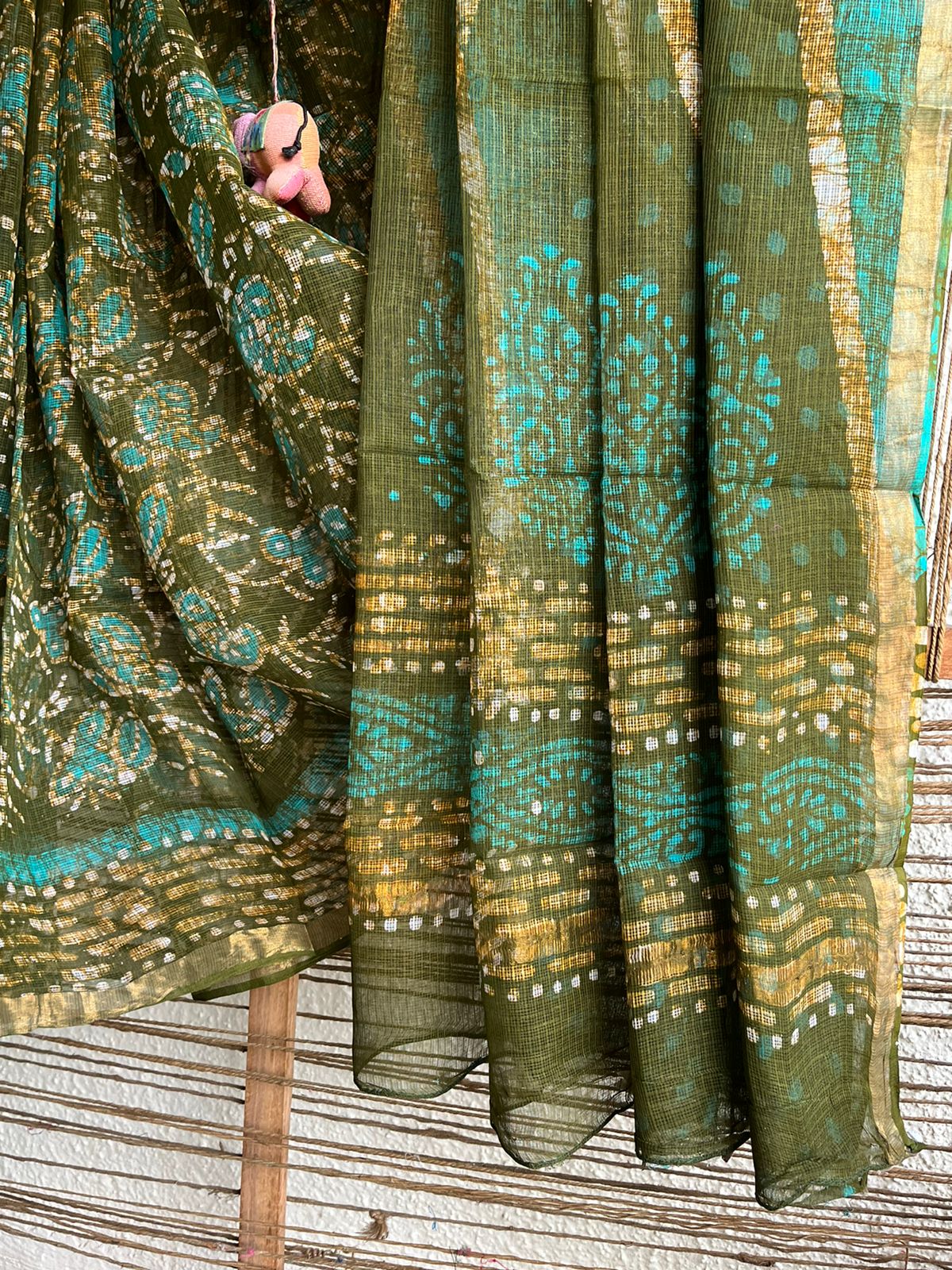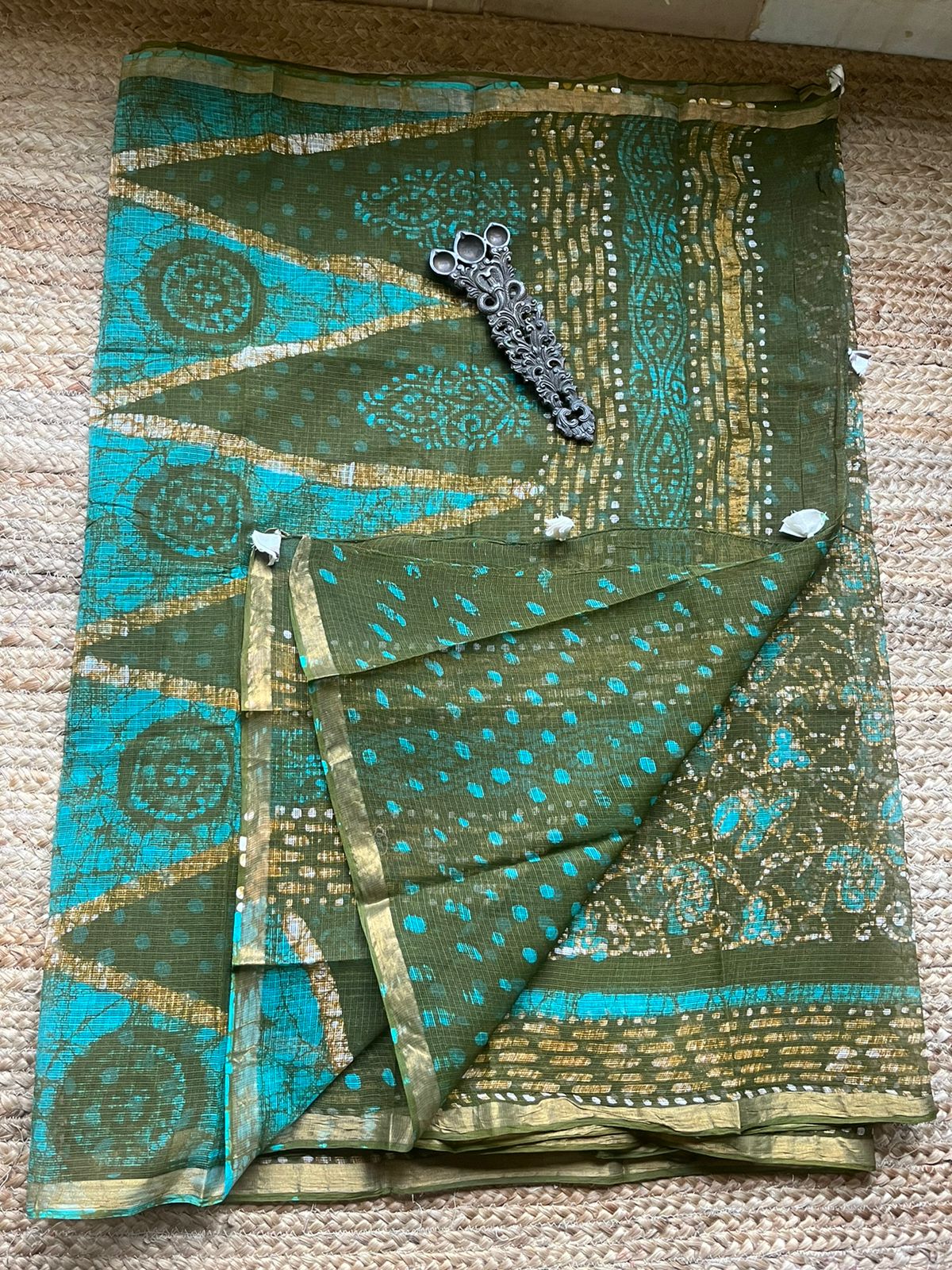 GREEN KOTA COTTON HAND BLOCK SAREE, HAS ITS OWN RUNNING BLOUSE PIECE