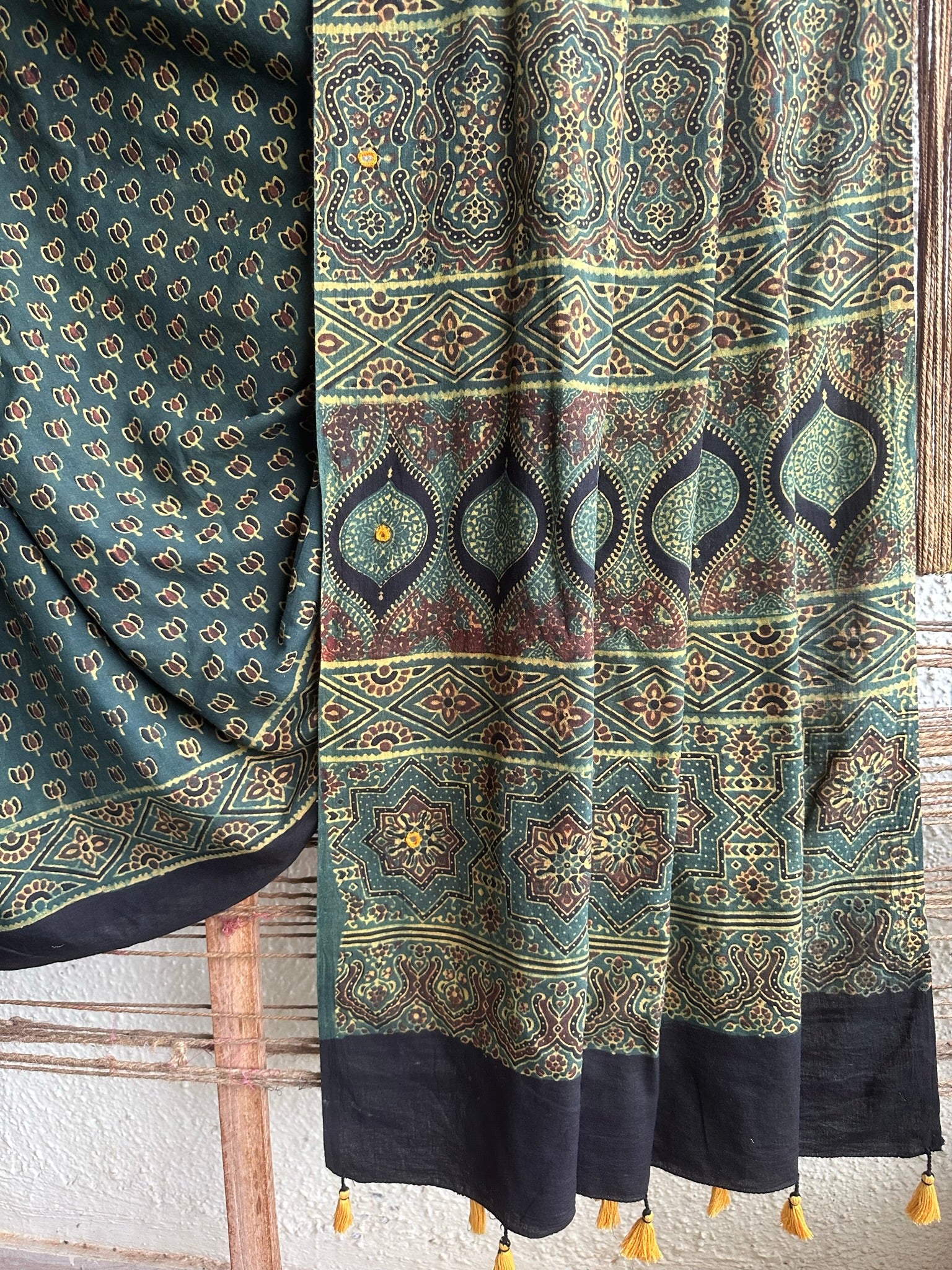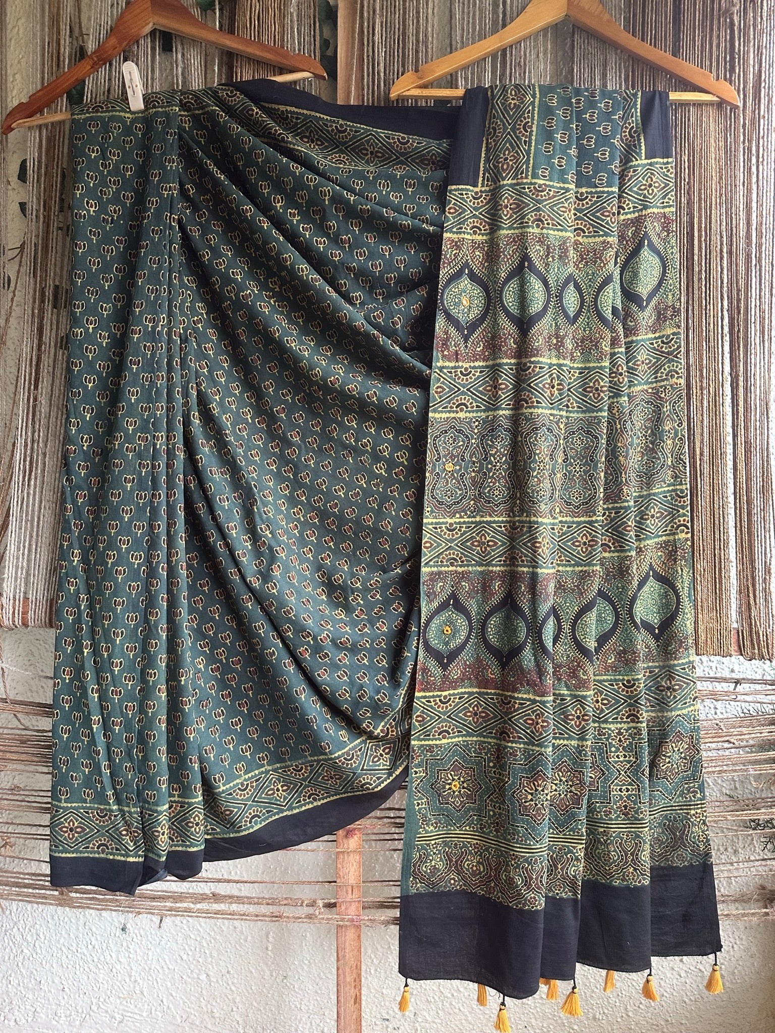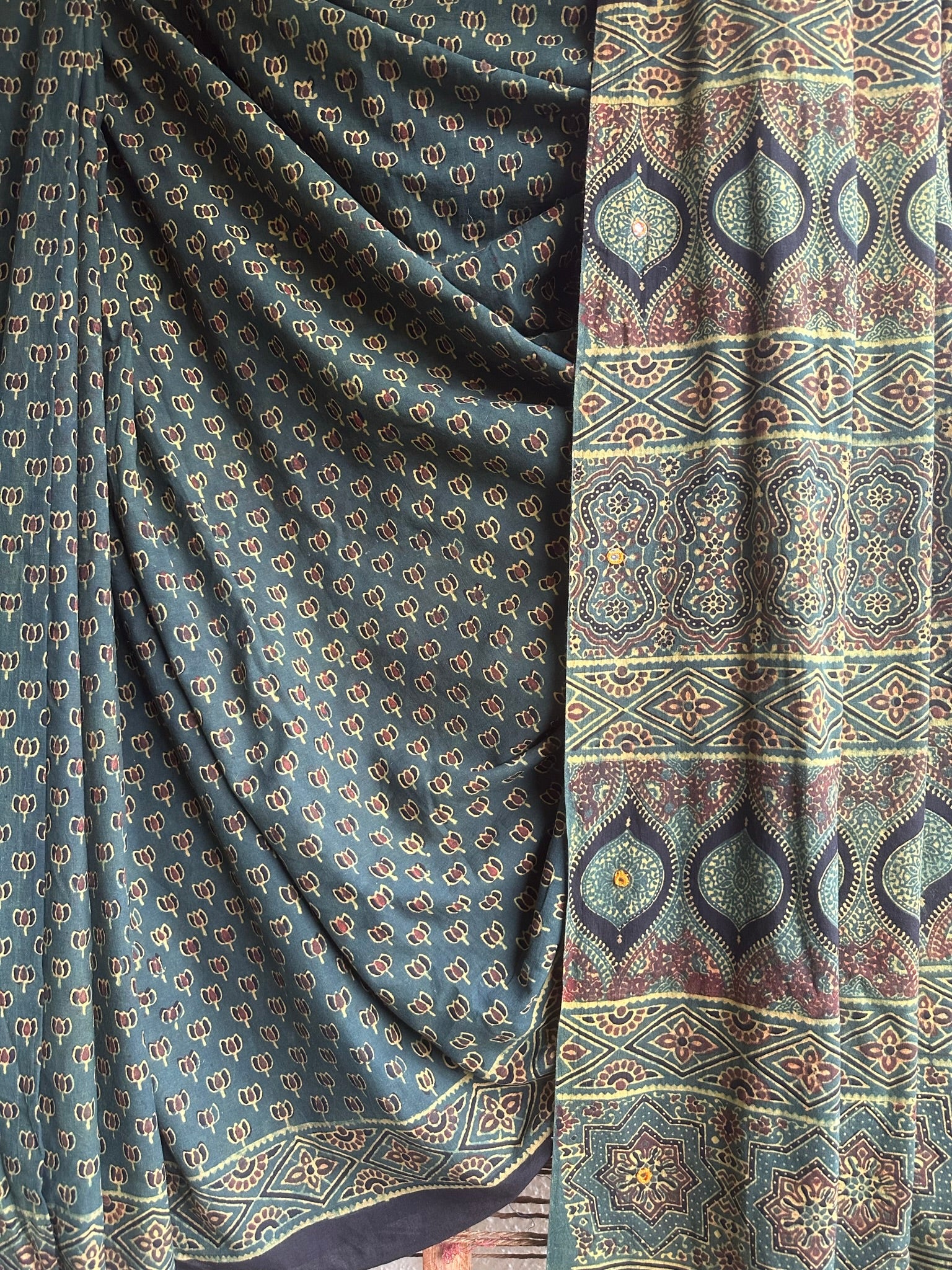 green cotton ajrakh hand block hand embroidery sari with blouse piece