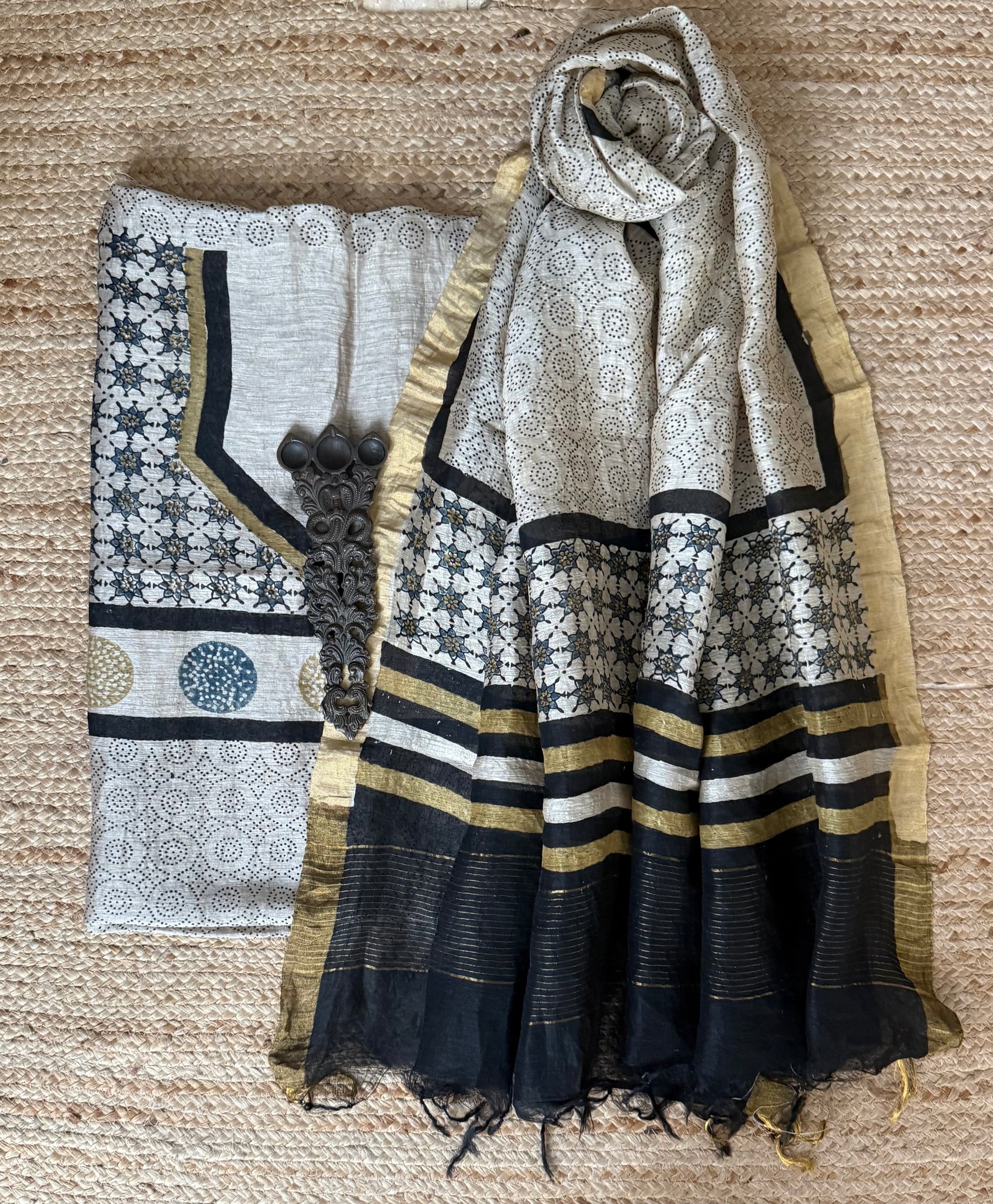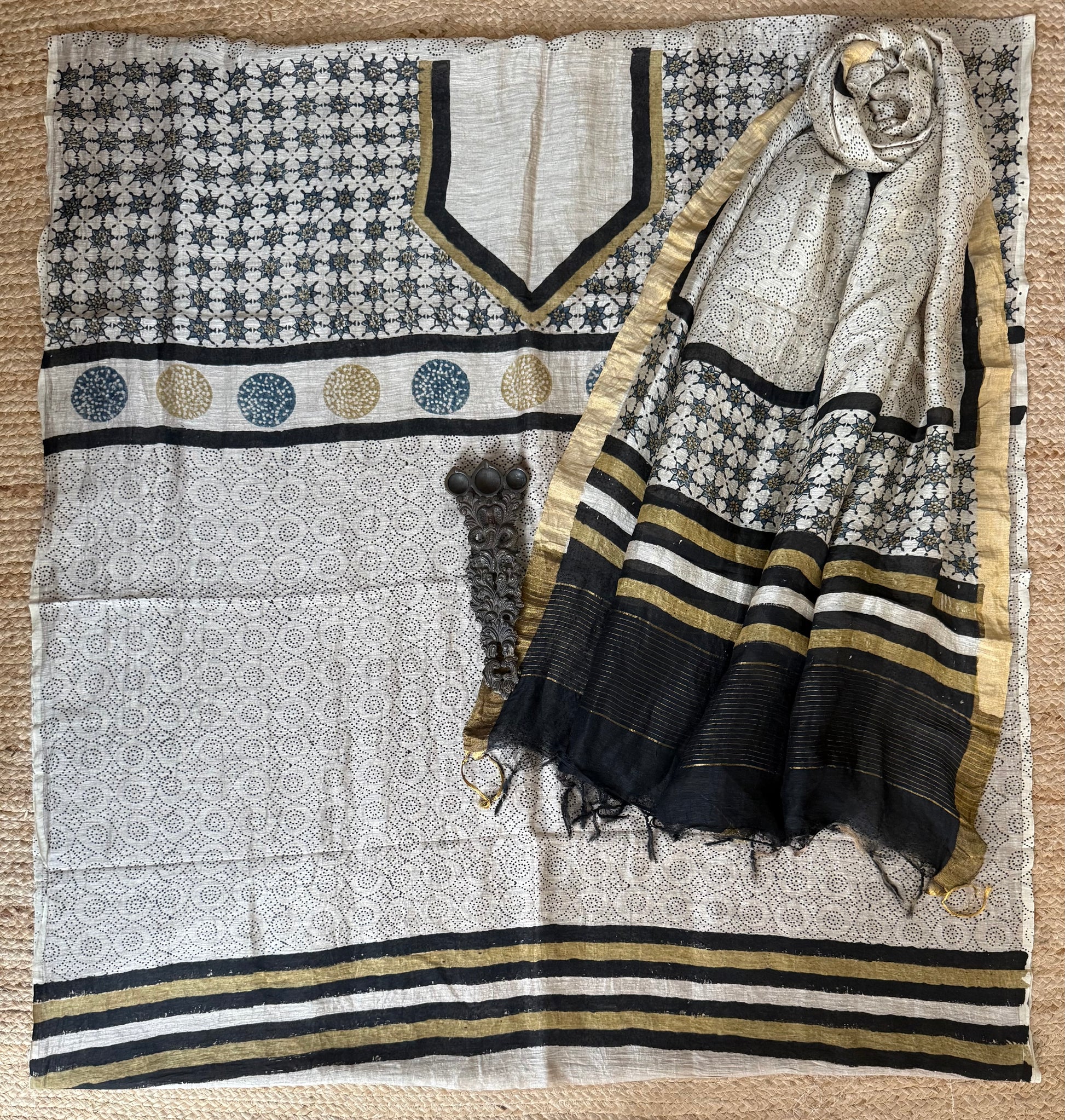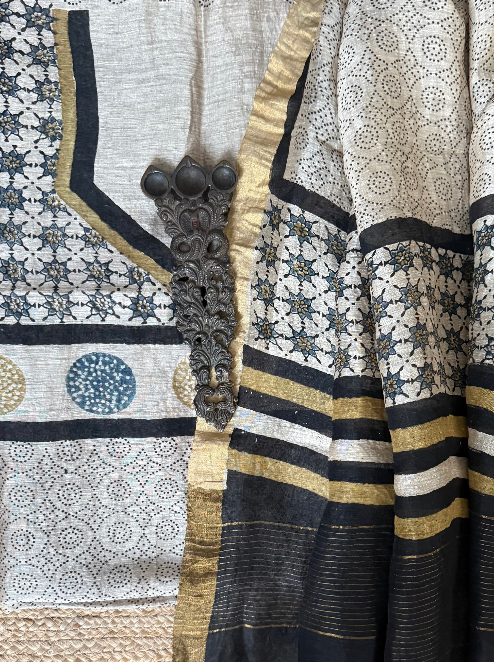 BEIGE AJRAKH BUTTA LINEN SILK HANDBLOCK SUIT SET