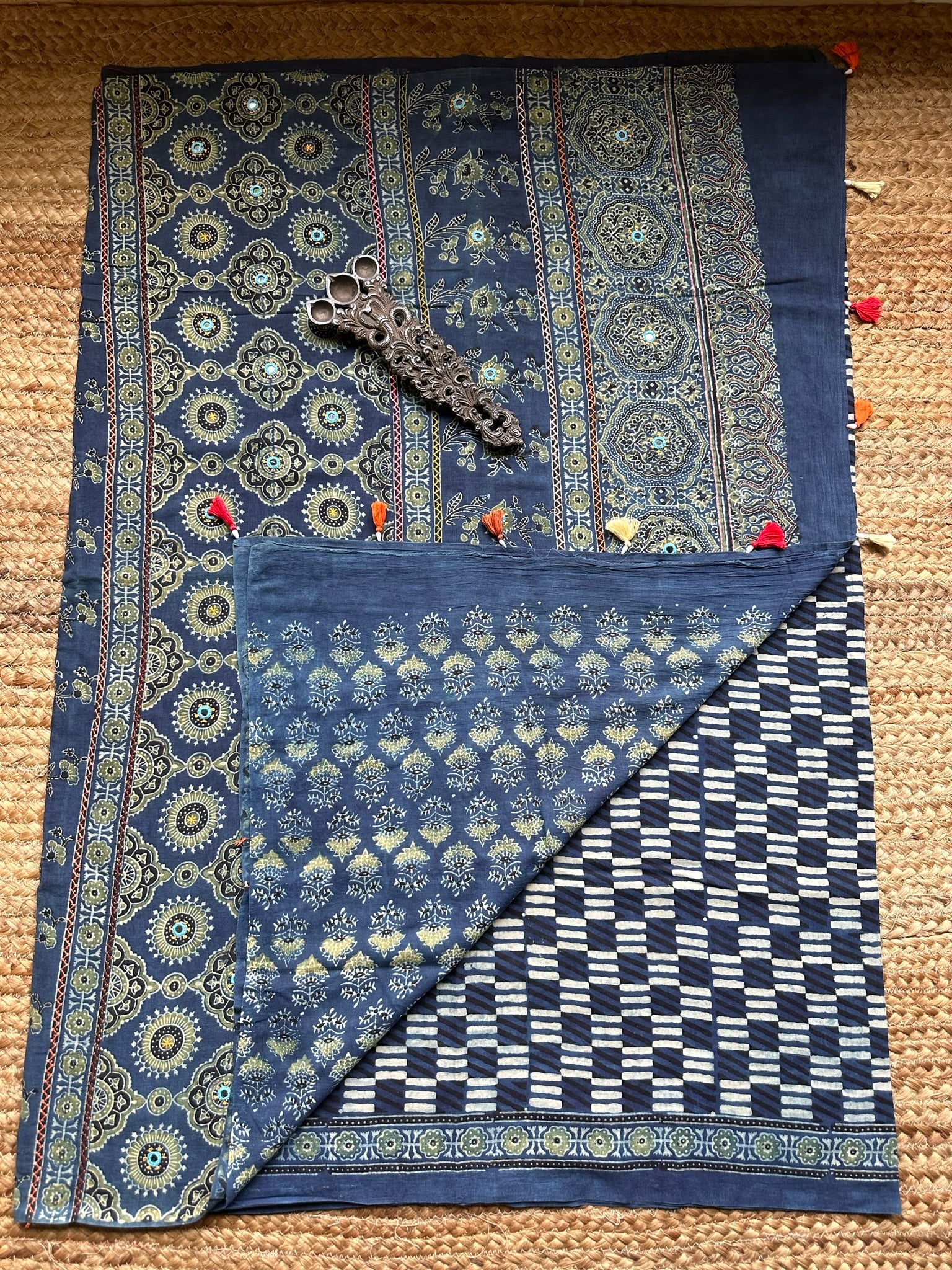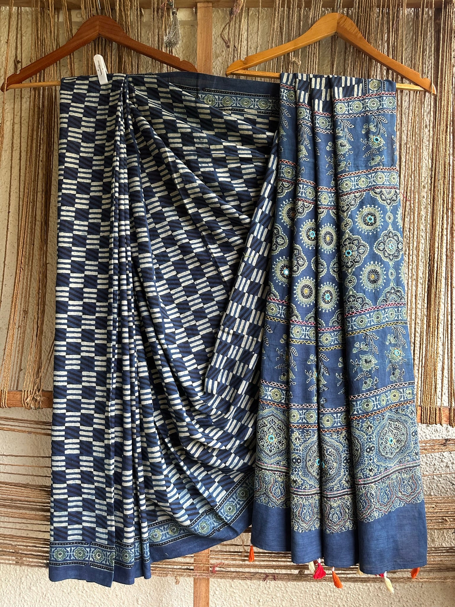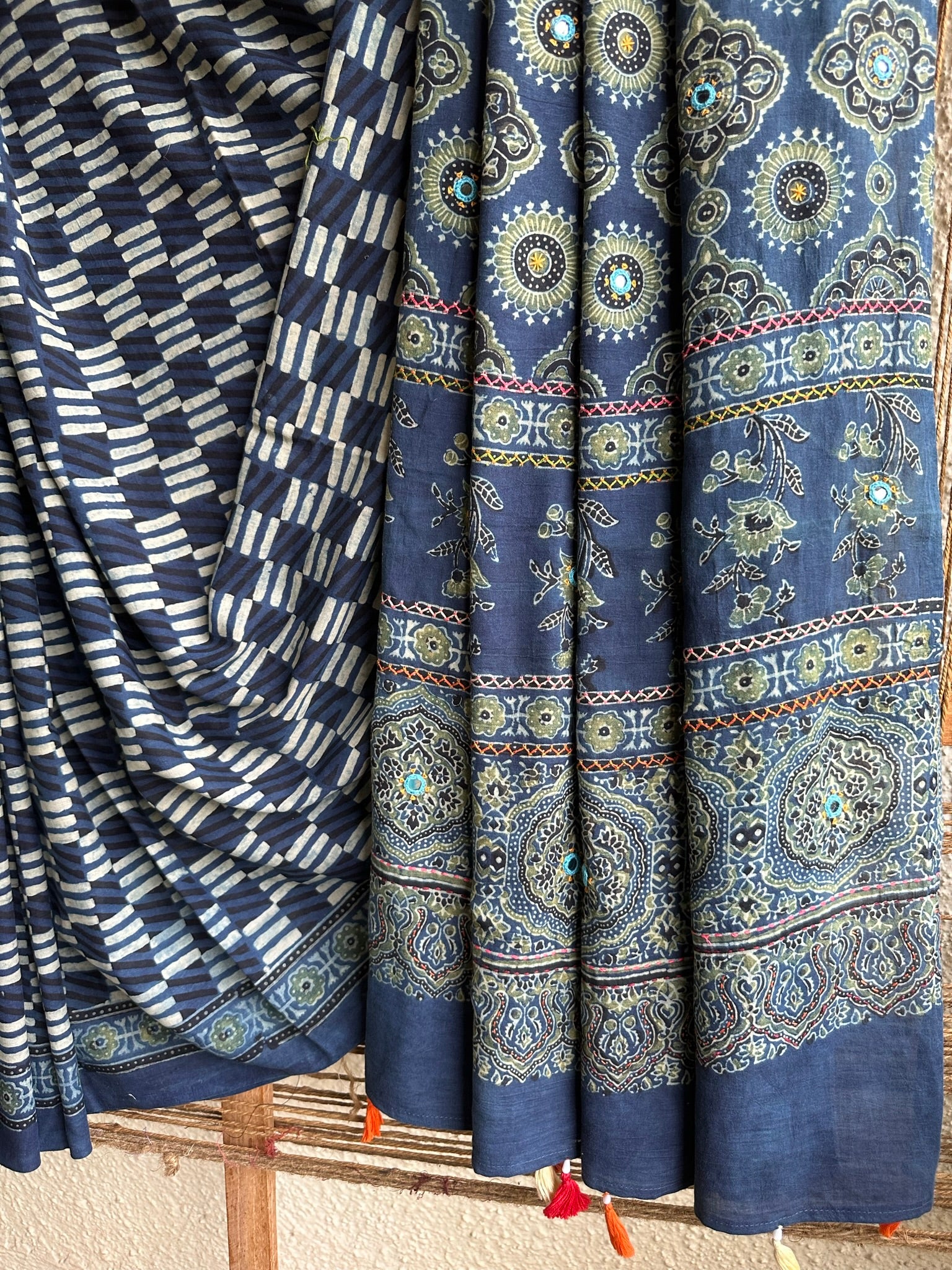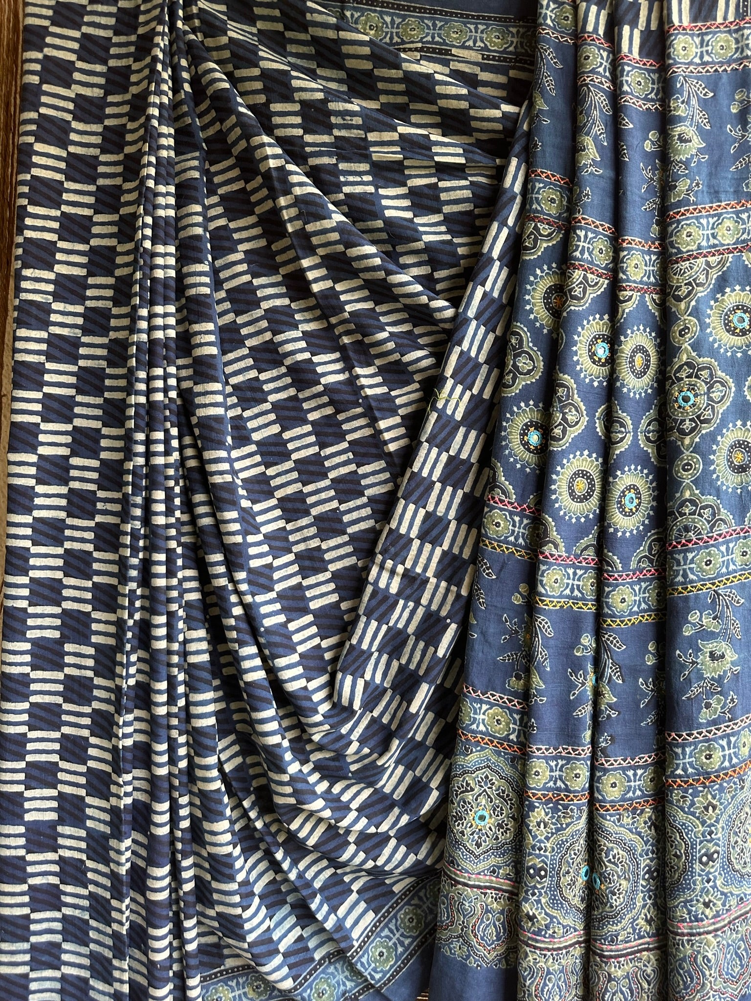 indigo check cotton ajrakh handblock hand embroidery sari with blouse piece
