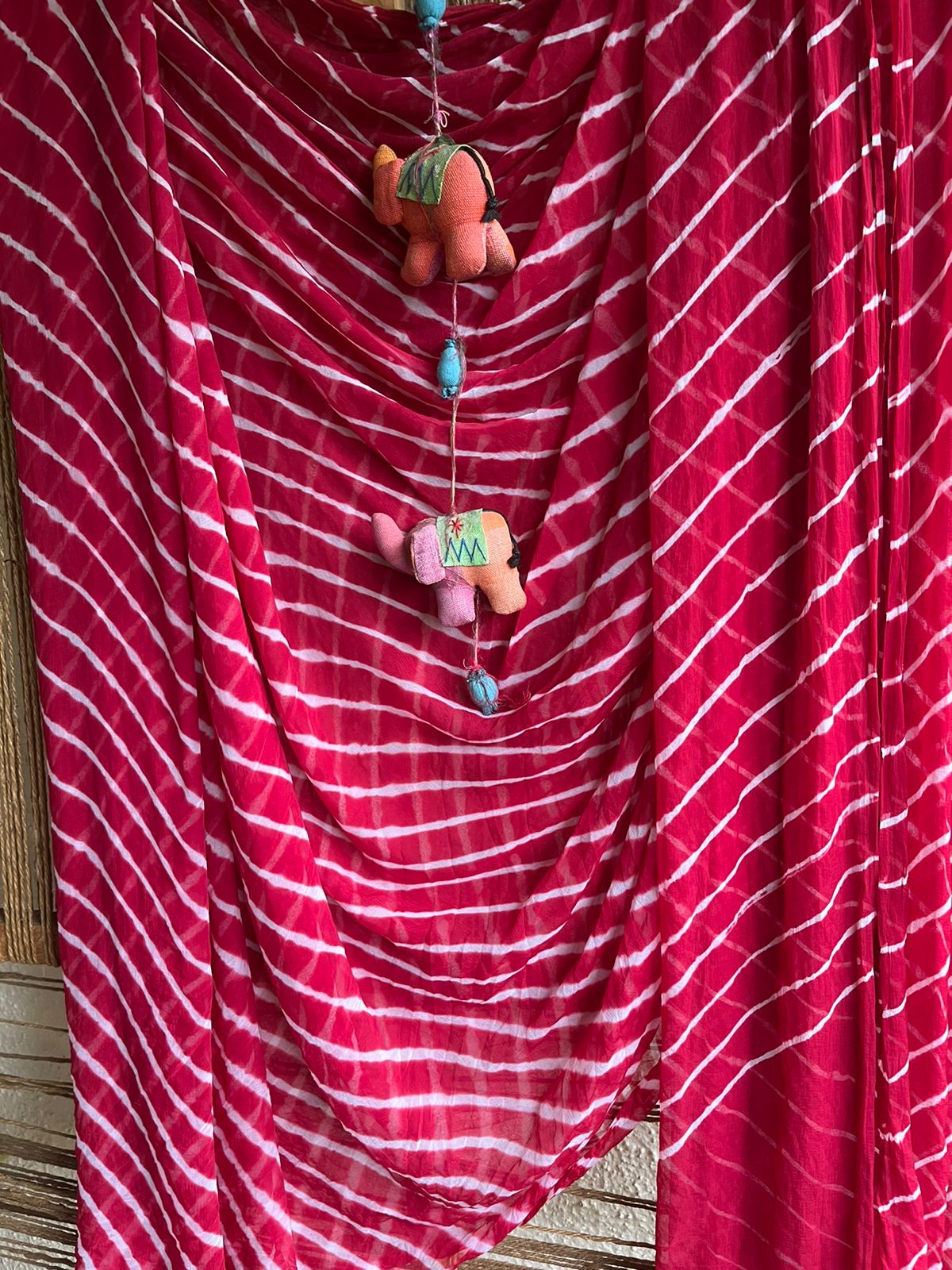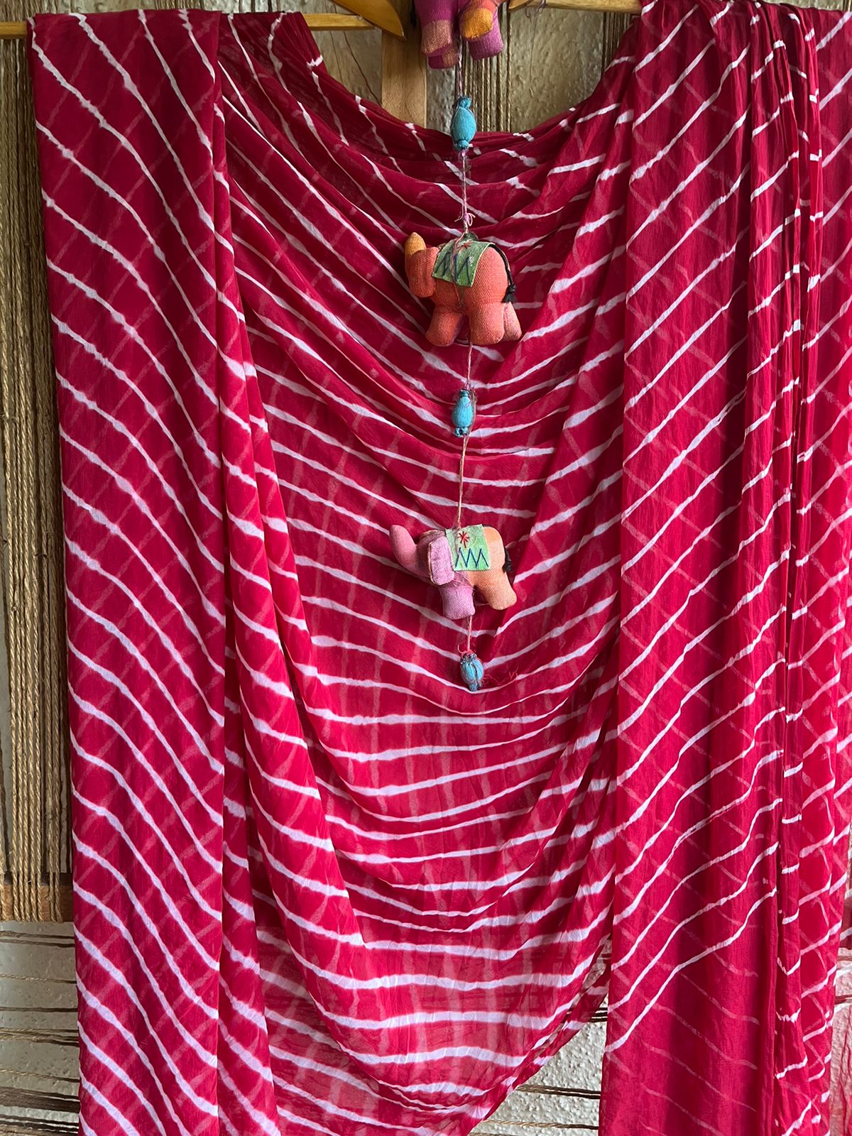 maroon white leheriya chiffon saree with have its own contrast blouse piece (80 cms)