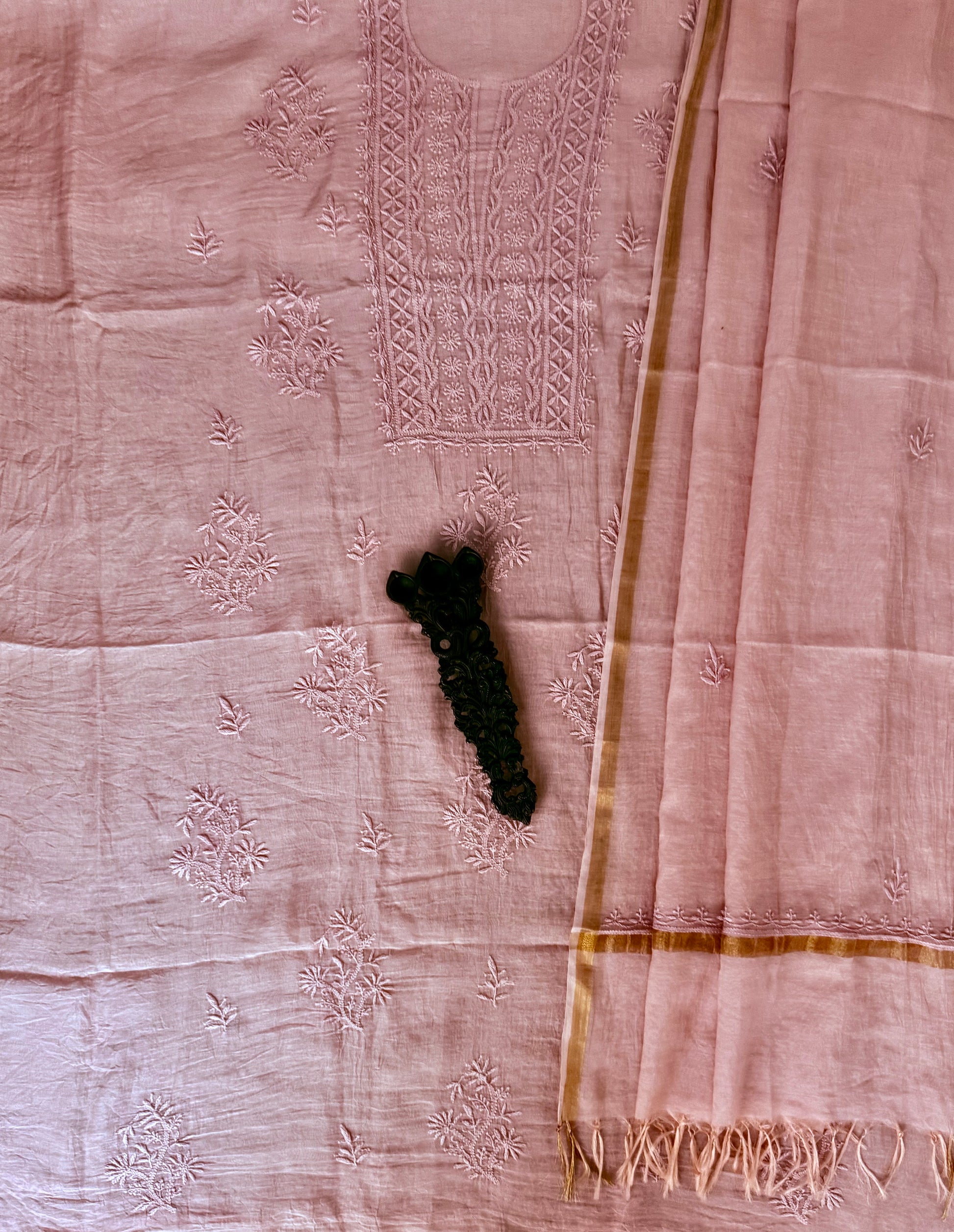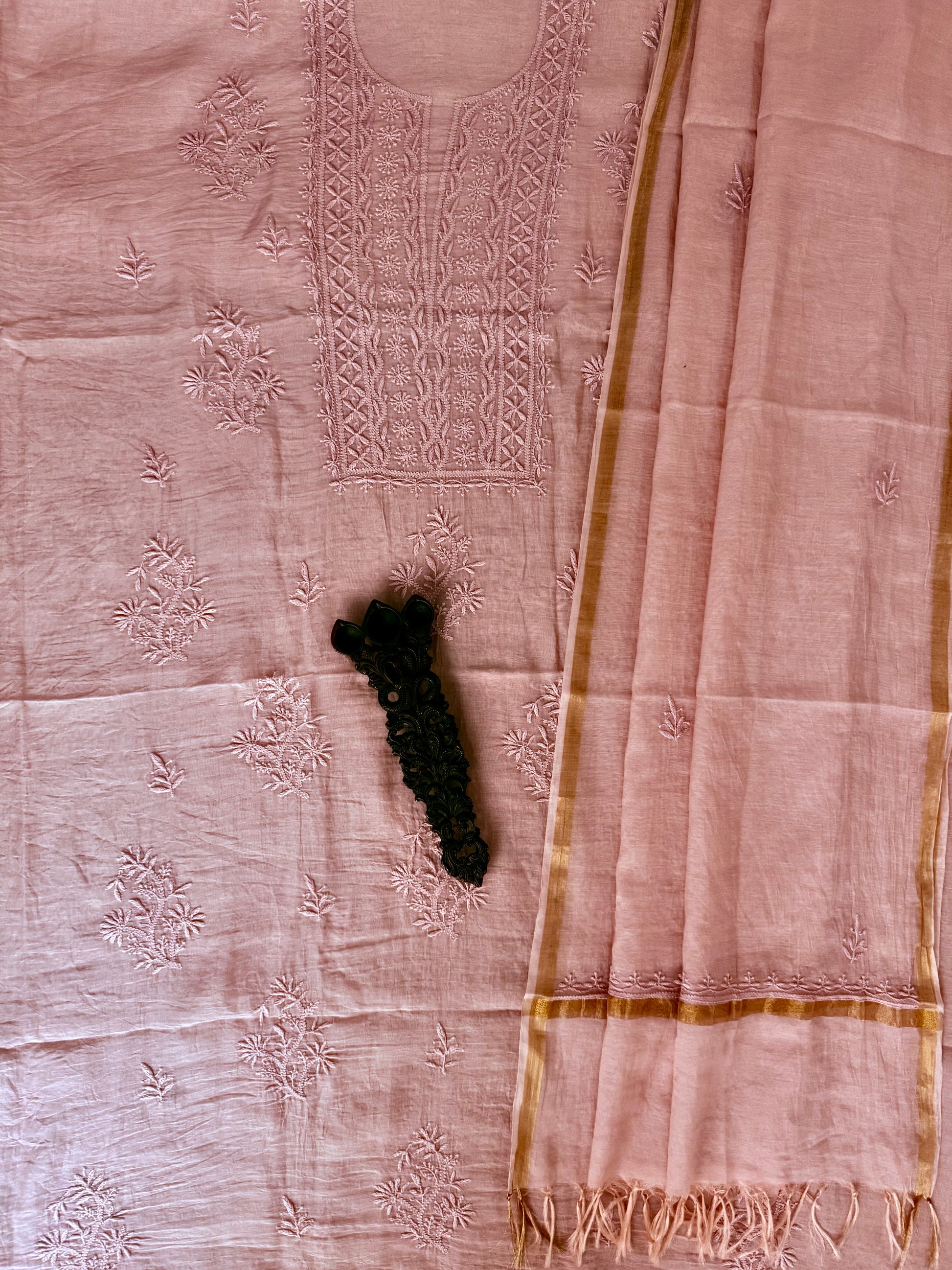 BALLERINA PINK PREMIUM CHANDERI COTTON LUCKNOWI CHICKENKARI HANDCRAFTED HAND EMBROIDERY THREE PIECE SUIT FABRIC: 2.5 MTRS METER BOTTOM:2.5 MTS DUPATTA: 2.5 MTRS * 35'' A SLIGHT DIFFERENCE IN SHADE COULD BE DUE TO THE CAMERA & LIGHTS. EMBRACE THE IMPERFECTION !! HAPPY HANDLOOM DRY CLEAN ONLY |