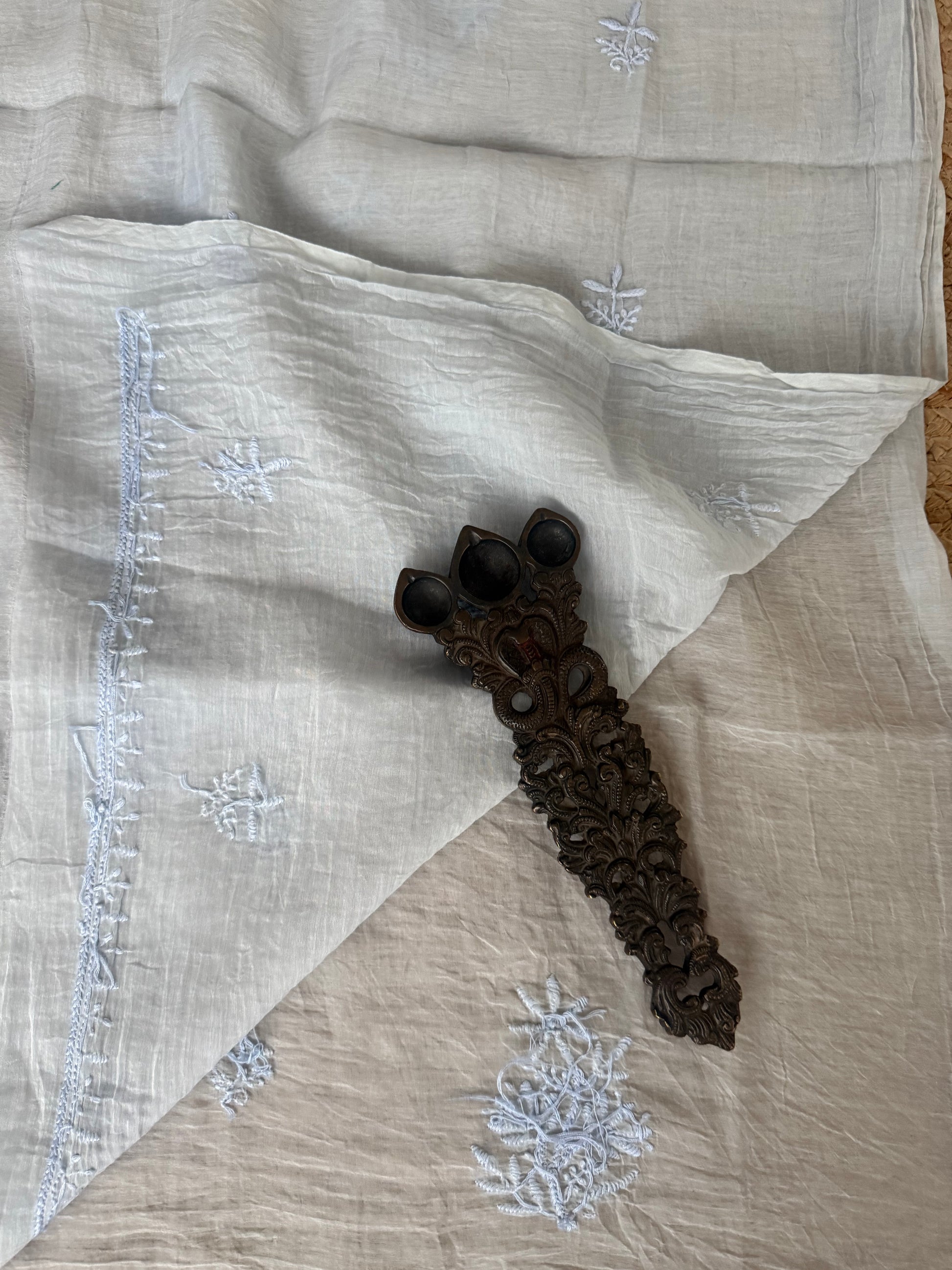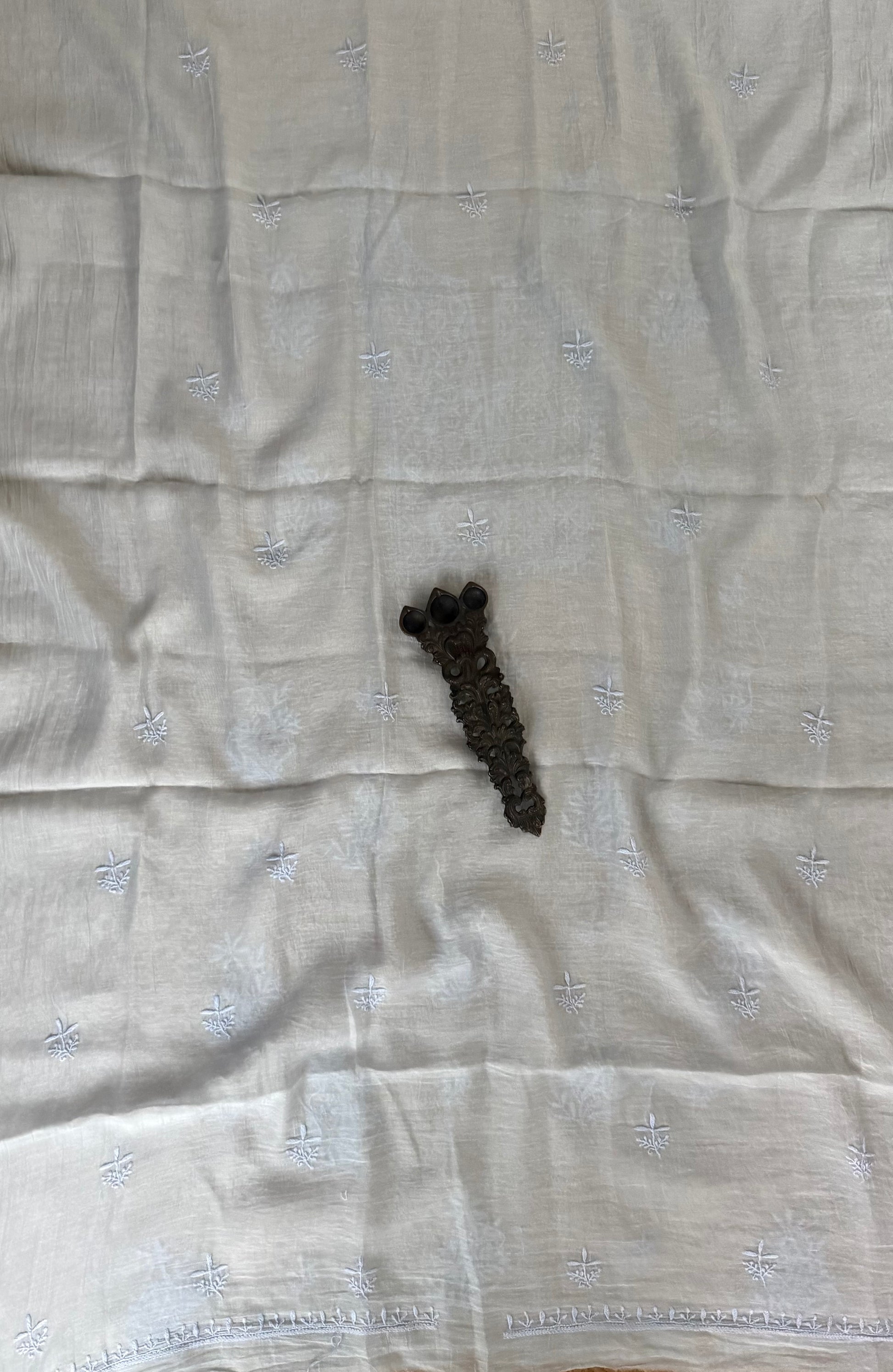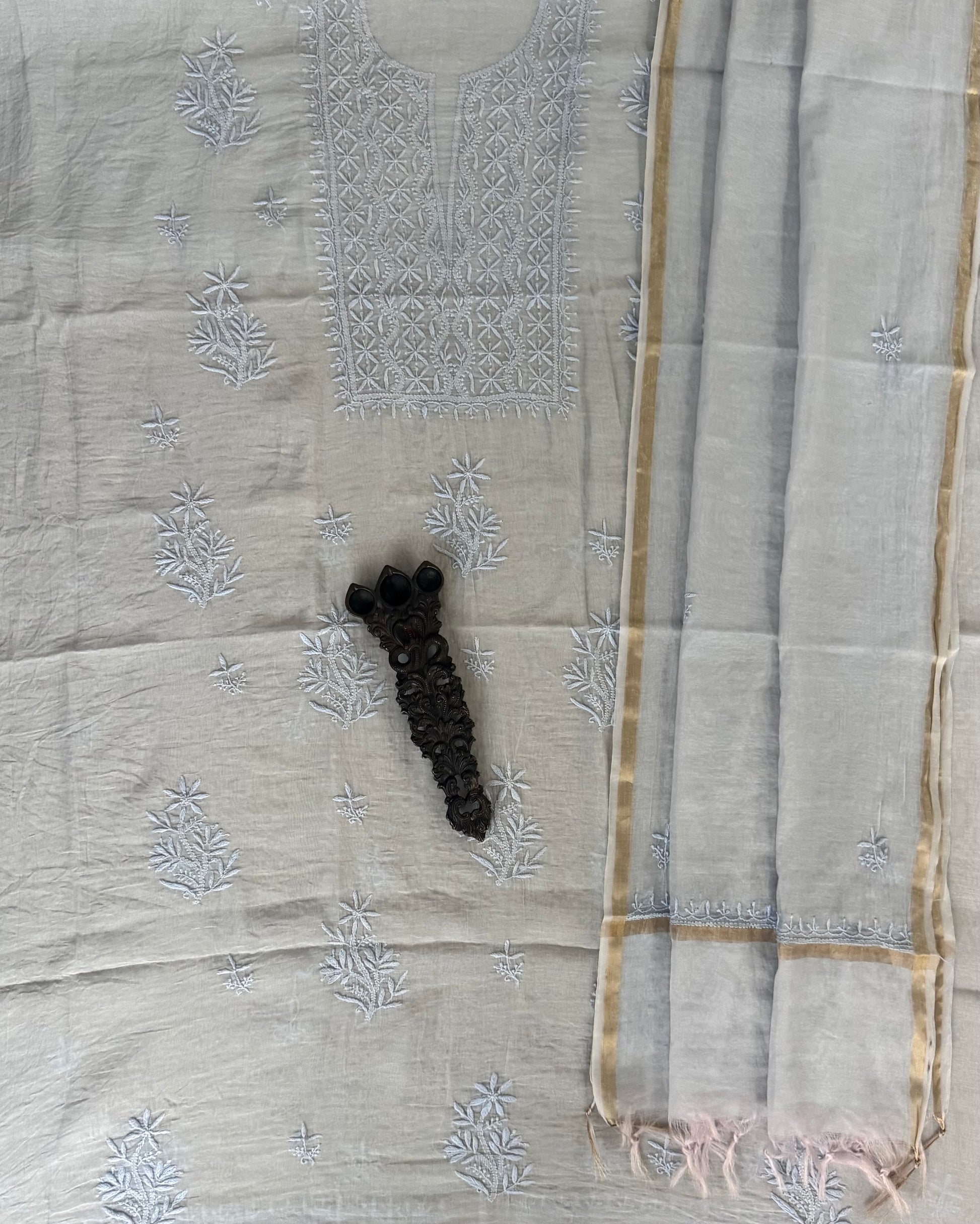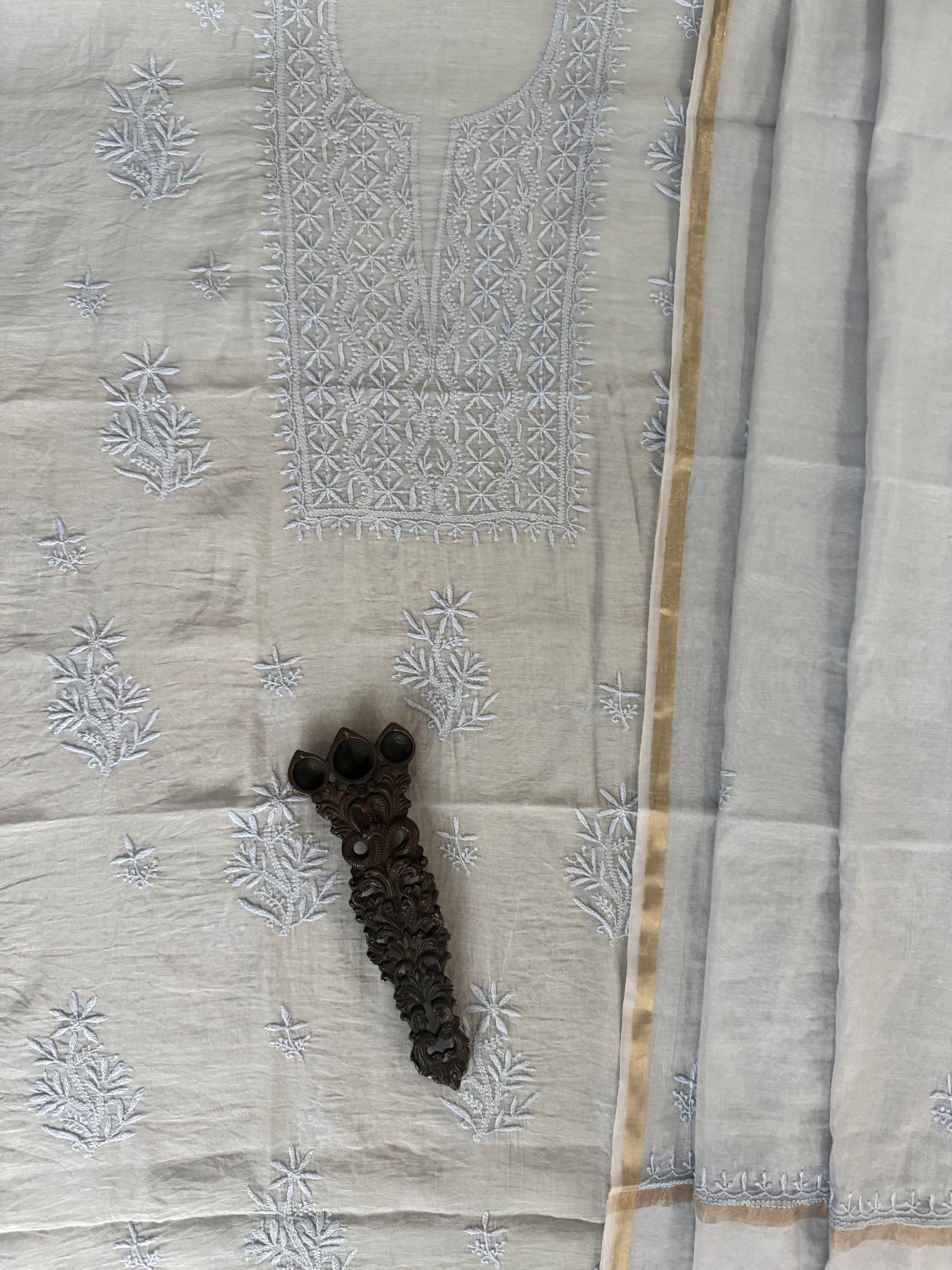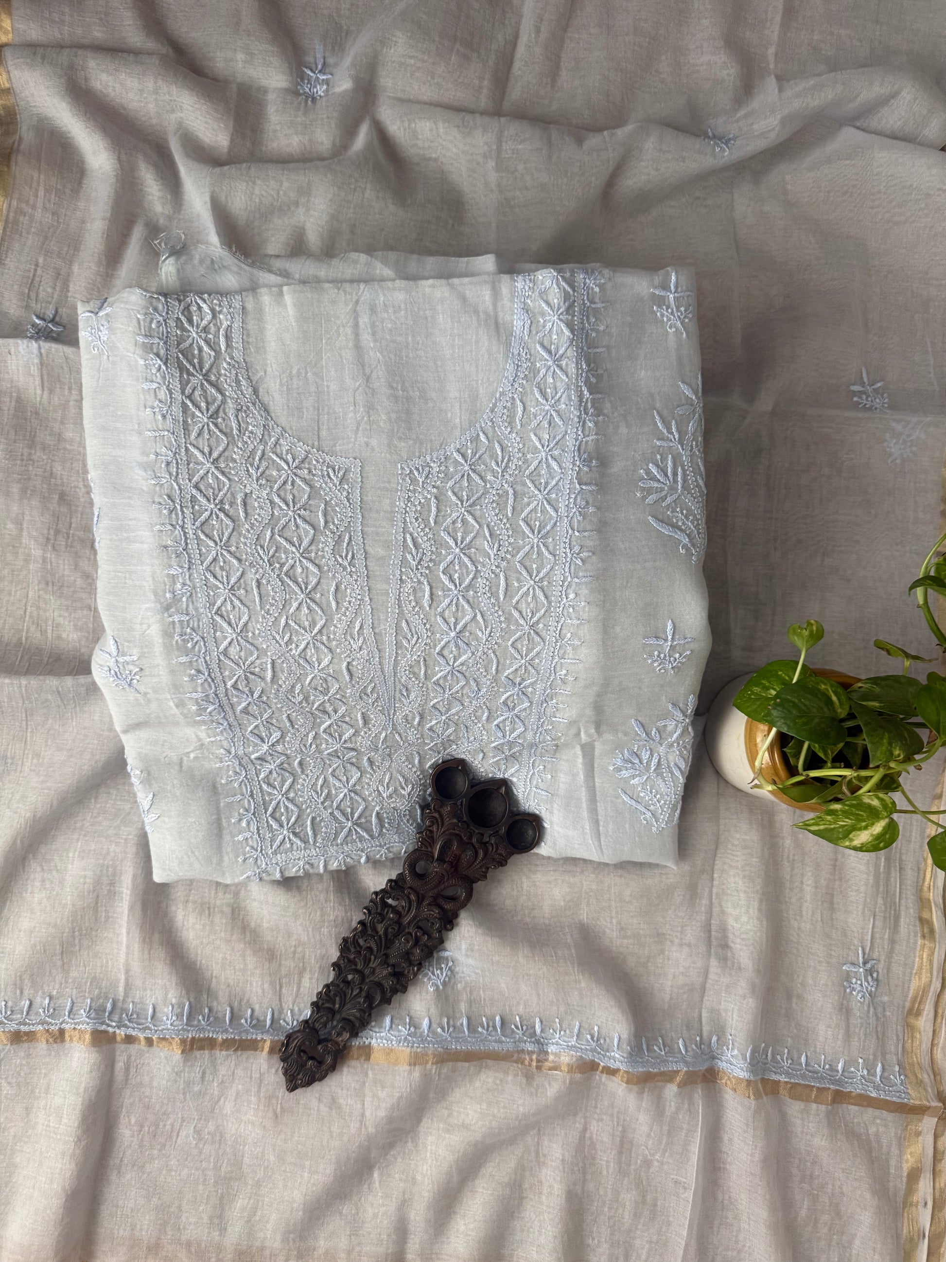 ICE BLUE PREMIUM MULL CHANDERI LUCKNOWI CHICKENKARI HAND EMBROIDERY THREE PIECE SUIT